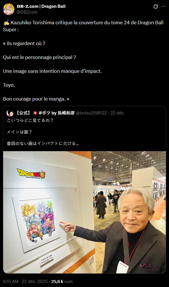 Et plus récemment encore, l’ancien éditeur de Toriyama avait critiqué la couverture du tome 24 de Dragon Ball Super à la Jump Festa 2026, dans un tweet qui a été interprété de plusieurs façon : certains y ont vu comme du mépris, d’autres des encouragements.