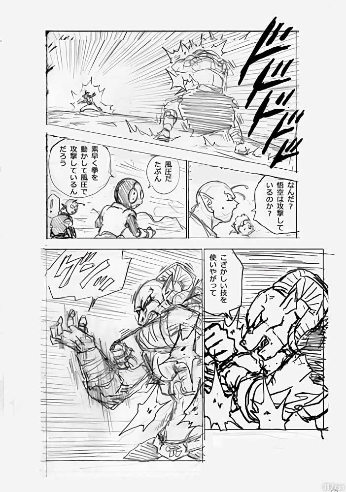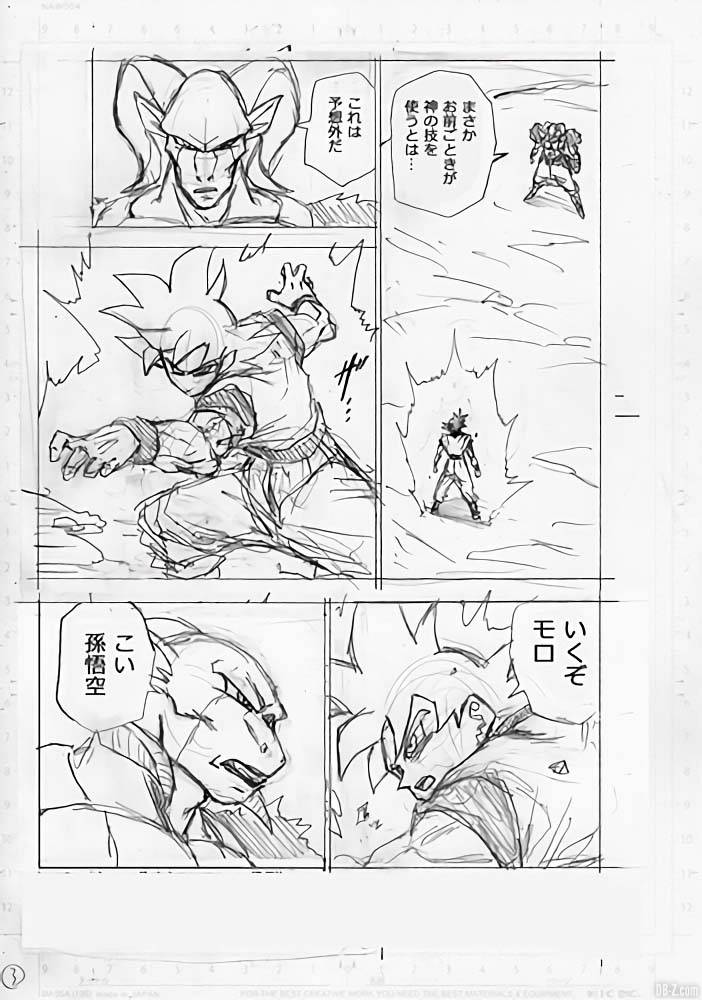 Les images semblent se concentrer sur la première pages du chapitre, avec le duel entre Moro vs Goku Ultra Instinct (incomplet). Les pages ci-dessous sont marquées comme brouillon (ネーム en Japonais), et ne sont qu’un aperçu du chapitre qui se développera comme toujours sur un total d’environ 40 pages.
