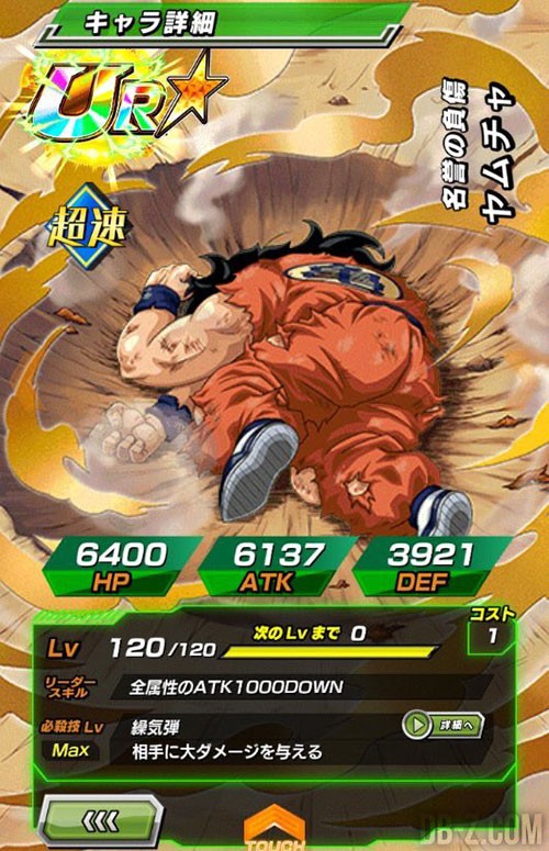 – Pour Yamcha KO : « En leader skill, -1000 à la défense de l’adversaire. Le Kamehameha inflige de lourds dommages à l’adversaire. »