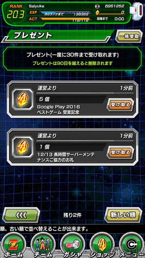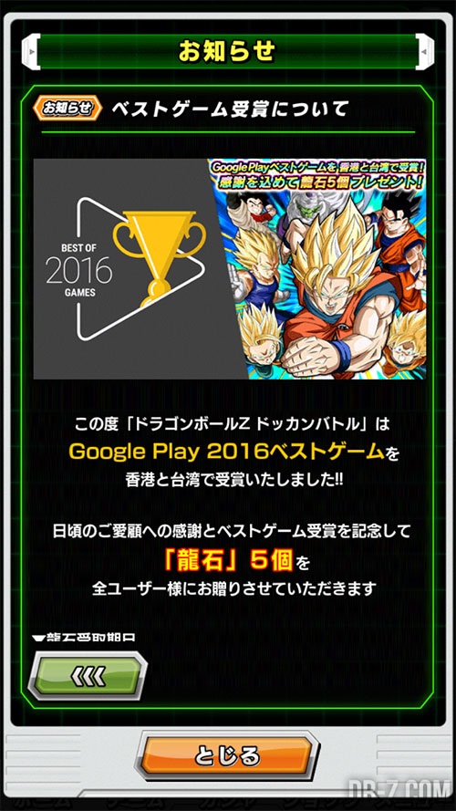 « Dragon Ball Z Dokkan Battle a été récompensé aux Google Play 2016 dans la catégorie meilleurs jeux, à Hong Kong et Taiwan ! Pour vous remercier et fêter l’award du meilleur jeu, nous offrons à tous les joueurs 5 pierres dragon. » (Bandai Namco Japon)