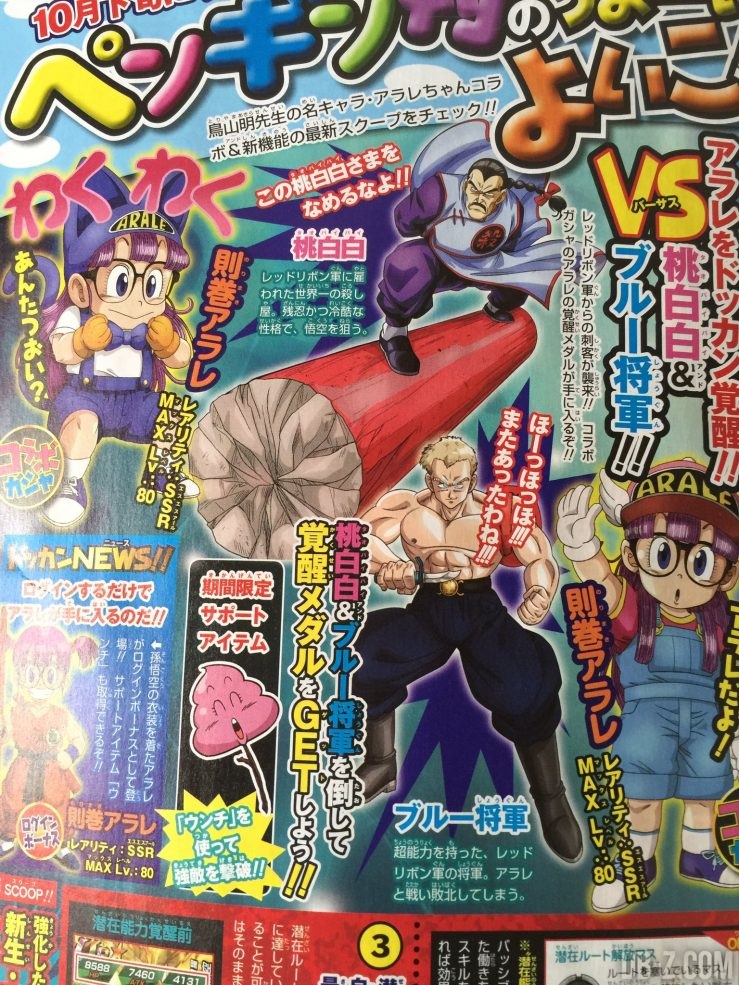 Alors que la version japonaise de Dragon Ball Z Dokkan Battle s’apprête à passer en 2.15.0, on apprend que Dr. Slump, le manga d’Akira Toriyama paru entre 1980 et 1985 dans le Weekly Shonen Jump, sera mis à l’honneur en octobre avec un nouvel événement, une nouvelle loterie dédiée, et de nouveaux personnages dont Arale, Taopaipai, le Général Blue, et le bâton de crotte rose en objet de support !