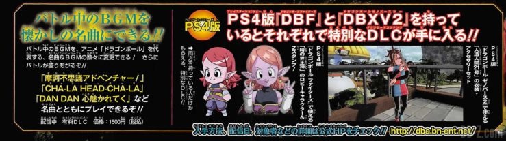 Le pack de DLC avec les openings des séries Dragon Ball, Dragon Ball Z, et Dragon Ball GT est également annoncé au Japon pour 1500 ¥ / 10 €, mais sa date de sortie reste inconnue. Il contiendra 3 musiques que vous pourrez évidemment écouter en plein combat :