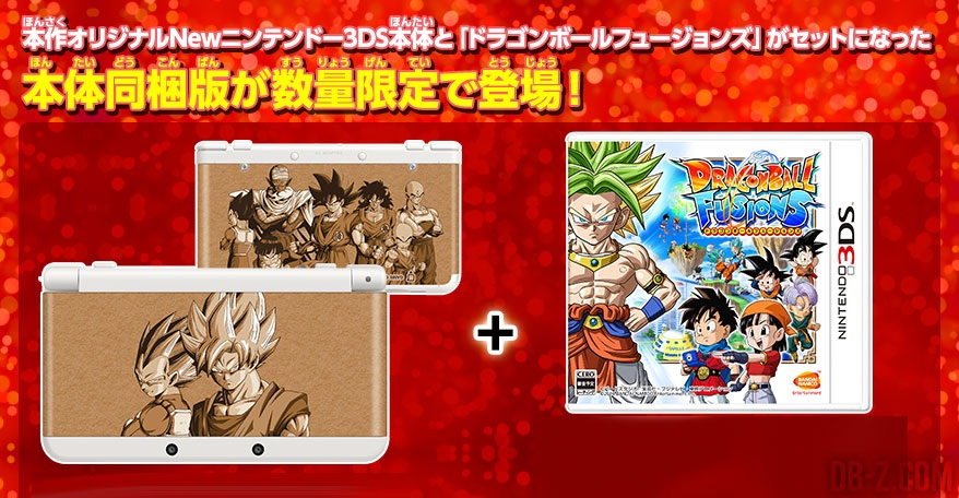 Pour rappel, un bundle collector et d’autres bonus de précommande avaient été annoncés avec Dragon Ball Fusions qui sortira au Japon le 04 août sur Nintendo 3DS. Le bundle contiendra :