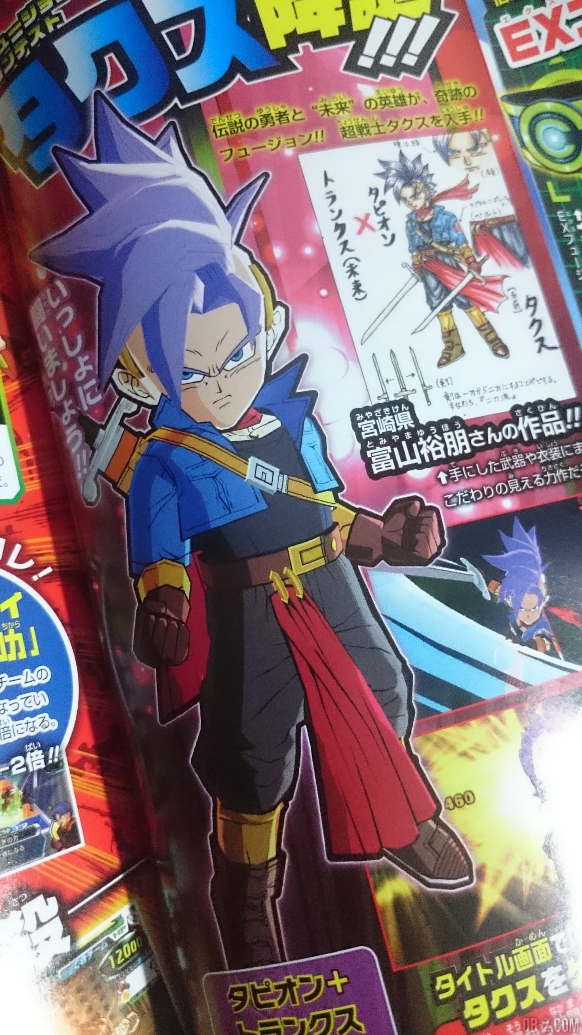 Voici la seconde fusion imaginée par un fan lors du concours de fusion lancé lors de l’annonce de Dragon Ball Fusions en janvier dernier ! En plus de Mister Satanman dévoilé la semaine dernière, la branche japonaise de Bandai Namco a sélectionné Taks, la fusion de Tapion et de Trunks. C’est l’oeuvre de Tomiyama Yuuhou de la préfecture de Miyazaki, et c’est le magazine bimestriel Saikyo Jump qui nous l’apprend grâce à ces clichés de Marty.