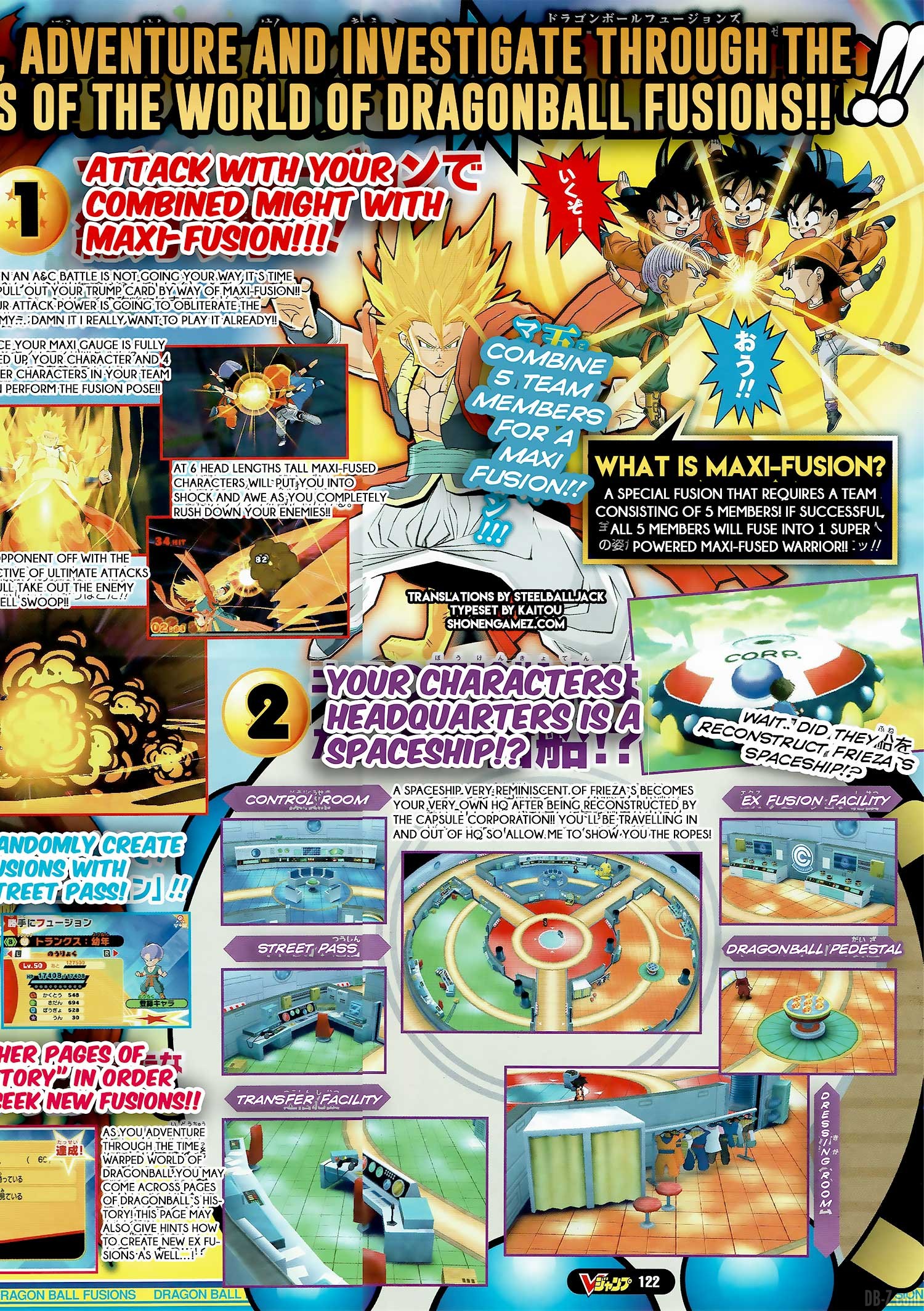 Le prochain jeu Dragon Ball Fusions qui sortira le 04 août au Japon sur Nintendo 3DS entame la dernière ligne droite de sa campagne promotionnelle en dévoilant quelques dernières informations dans le nouveau numéro du V-Jump. En effet, le magazine japonais qui sortira officiellement demain au Japon nous montre un nouveau personnage issu d’une Ultra Fusion de personnages. Pour rappel, dans le jeu DB Fusions uniquement, une Ultra Fusion est le résultat d’une fusion entre 5 individus.