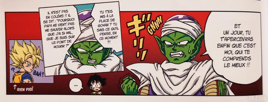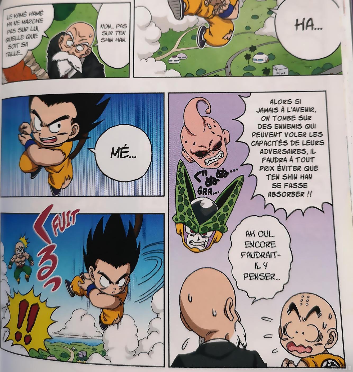 Aussi, Naho-sensei casse souvent le fameux 4ème mur, ce « mur » imaginaire qui sépare la scène et le lecteur. En brisant ce 4ème mur, l’auteur s’adresse directement au lecteur, souvent pour faire passer quelques vannes comme c’est le cas dans Dragon Ball SD (et parfois dans le Dragon Ball d’Akira Toriyama aussi). On le remarque souvent dans les images qui séparent chaque chapitre du tome.