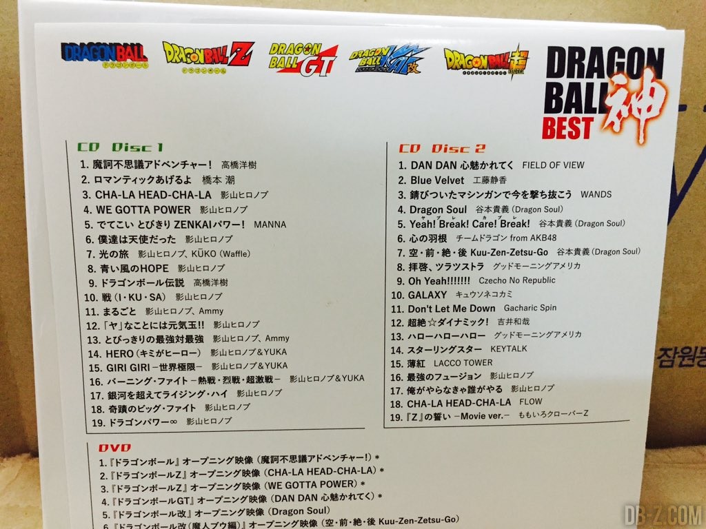 De même, les 2 CD contiendront toutes les musiques d’openings / endings de Dragon Ball à Dragon Ball Super en passant par Dragon Ball GT et certains épisodes TV spéciaux.