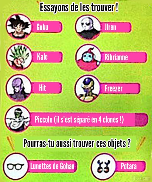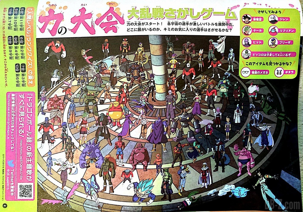 Nous sommes en plein arc « Survie de l’Univers » de Dragon Ball Super. Et pour survivre, chacun des 8 Univers désignés comme étant les moins bons par les Rois Zeno doivent combattre au Tournoi du Pouvoir pour sauver leur peau. Chaque Univers a aligné une équipe de 10 combattants, et si tous les combattants d’une même équipe sont éliminés, alors leur Univers sera aussitôt anéanti. Voici les 80 combattants qui participent à ce tournoi. Saurez-vous trouver résoudre les énigmes de l’image de droite ?
