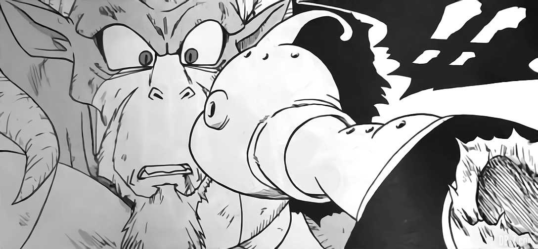Goku, Vegeta et Meerus continuent de regarder ce combat a sens unique, tandis que Goku dit que Buu peut facilement gagner si les choses continuent comme elles sont. Meerus admet que Buu domine complètement Moro, mais ce dernier est capable d’utiliser encore pas mal de pouvoirs magiques pour renverser la tendance. Il demande donc à Buu d’utiliser « cette technique » pour s’assurer que Moro ne puisse pas contre-attaquer.