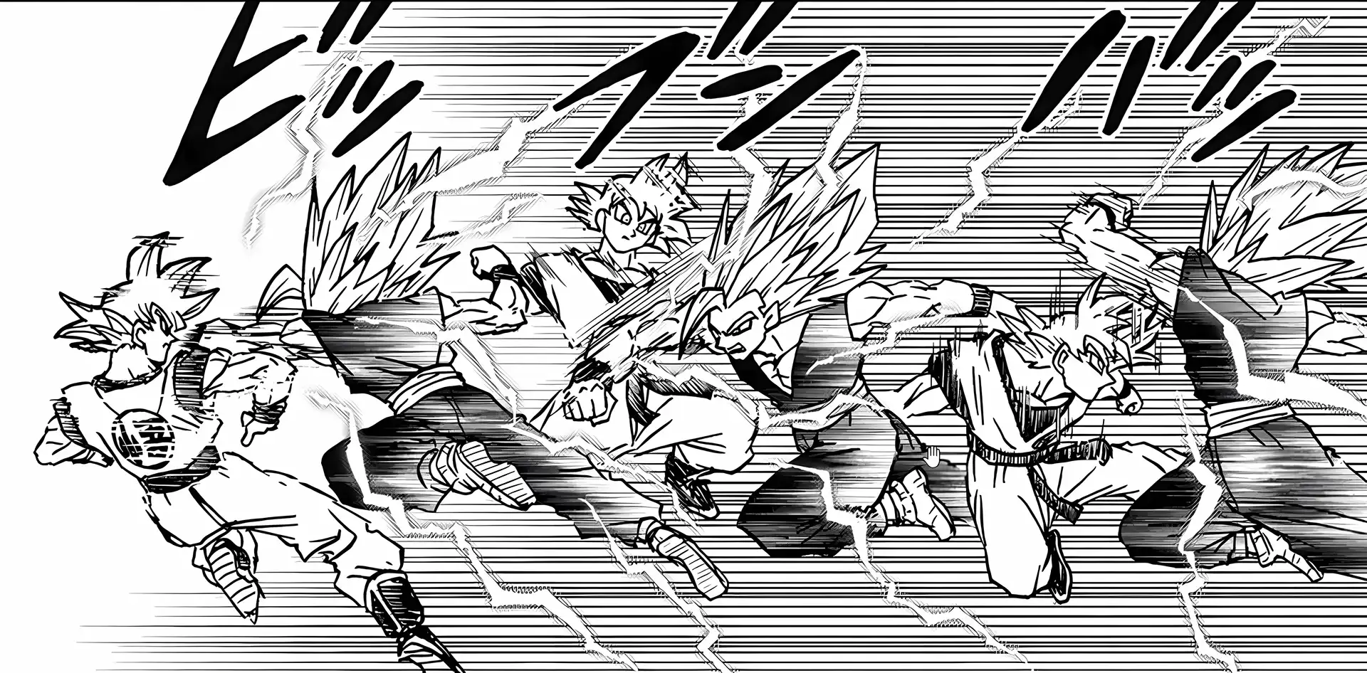Dans son résumé, le chapitre débute avec la suite du combat entre Goku Ultra Instinct et Gohan Beast, comme les brouillons du chapitre 103 le montraient. Goku teste Gohan, et décide d’arrêter le combat après plusieurs échanges de coups.