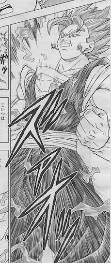 Le chapitre 23 de Dragon Ball Super sortira dans le V-Jump ce 21 avril, et il devrait nous approcher plus que jamais de la fin de l’arc Trunks de Dragon Ball Super. Sans grosse surprise – tout du moins si vous avez suivi l’animé – Goku et Vegeta fusionneront en Vegetto grâce aux Potaras. Voici deux images de Vegetto qui semble rapidement se transformer en Super Saiyan Blue, si on en croit les images postées par @yonkouprod sur Twitter.
