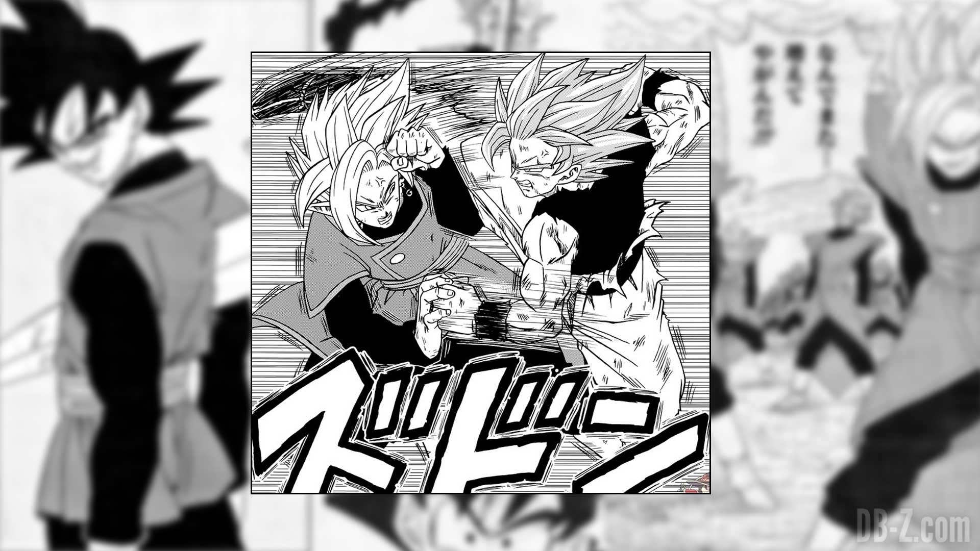 Dans ce chapitre, Goku et Vegeta sont toujours face à la fusion de Zamasu. Après avoir fusionné en Vegetto, ils ont mené le combat pendant quelques temps, mais ont rapidement dé-fusionné à la surprise générale. Désormais, Goku en Super Saiyan Blue a pris le relais face à Zamasu. Vegeta a expliqué dans le chapitre précédent que Goku était celui qui avait réussi à maîtriser à 100% la forme de Super Saiyan Blue, et c’est pourquoi il a demandé à Trunks de le soigner en premier. La suite du combat est à venir ci-dessous…