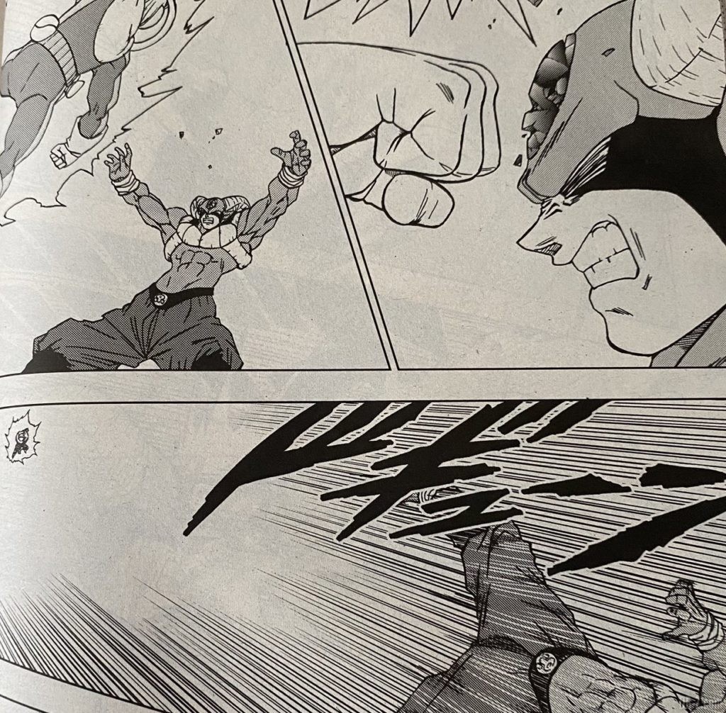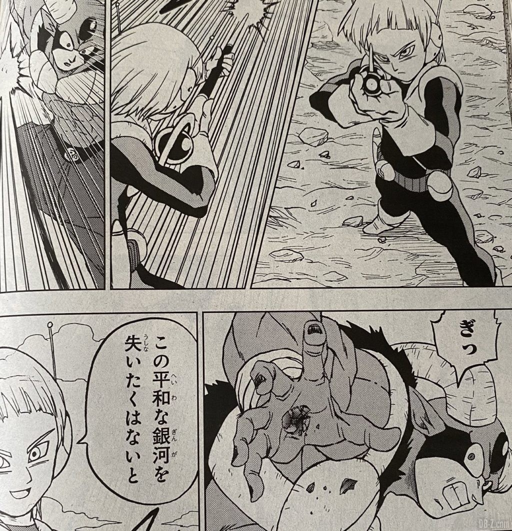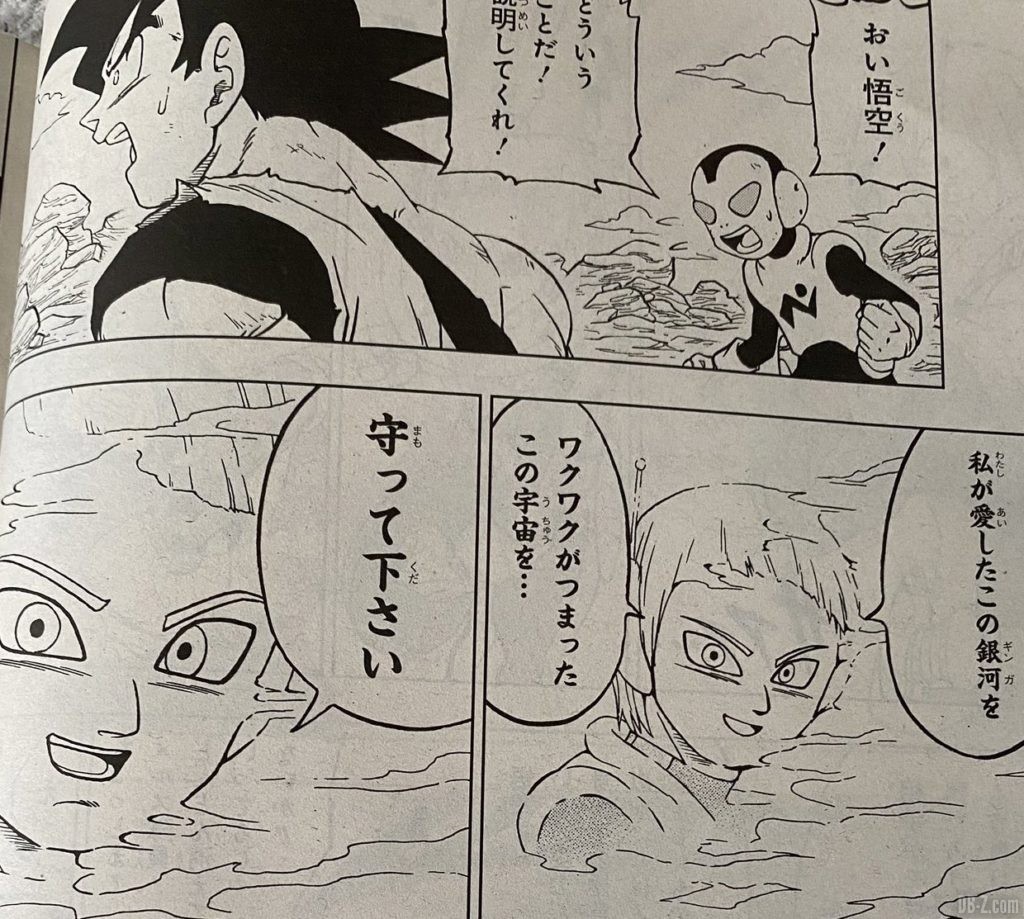 Vous pouvez également relire les 10 premières pages du chapitre 63 de DBS, offertes sous forme de brouillons par le site officiel de Dragon Ball, au début du mois d’août. DBSHype résume le chapitre ainsi : Pendant que Merus combat Moro, Dende guérit Goku et les autres. Goku rejoint le champ de bataille juste après, et passe en mode Ultra Instinct. Il attaque Moro, mais Moro le bat à nouveau avec facilité. Après avoir vaincu Goku, Moro se faufile et essaie de tenir le cou de Merus pour qu’il puisse copier ses capacités. Mais Merus utilise son bâton d’ange pour lui trancher le bras et Moro ne parvient pas à le copier. En utilisant son bâton d’ange et un pistolet, Merus détruit les cristaux que Moro avait dans la paume de ses deux mains. Après avoir brisé les pierres qu’il avait dans ses mains, Merus charge son énergie et une aura apparaît autour de lui, il est sur le point de charger à nouveau Moro mais à cet instant, Beerus et Whis arrivent sur le champ de bataille. Au fur et à mesure que le halo apparaît, Merus devient quelque peu transparent, juste après il attaque rapidement Moro. Pendant qu’il se dirige vers lui, Merus se souvient de sa conversation avec Goku dans la salle du temps. Beerus et Whis ne l’arrêtent pas. Pendant ce temps, Moro lui lance une grosse explosion mais cela ne fonctionne pas, Merus apparaît juste devant son visage. Alors que Merus apparaît juste devant lui, il frappe la grosse pierre que Moro avait dans la tête, qui se brise, et Moro tombe par terre. Merus commence à disparaître, il regarde Goku et a également un sourire sur son visage, il lui dit de protéger l’Univers (un peu comme C-16 qui disait à Gohan de protéger la Terre) puis disparaît complètement. Goku est de dos, un peu dans une position similaire que quand il a vu Freezer tuer Krillin avant de passer en Super Saiyan. Les chapitre se terminent ici. Goku est complètement sous le choc après la disparition de Merus.