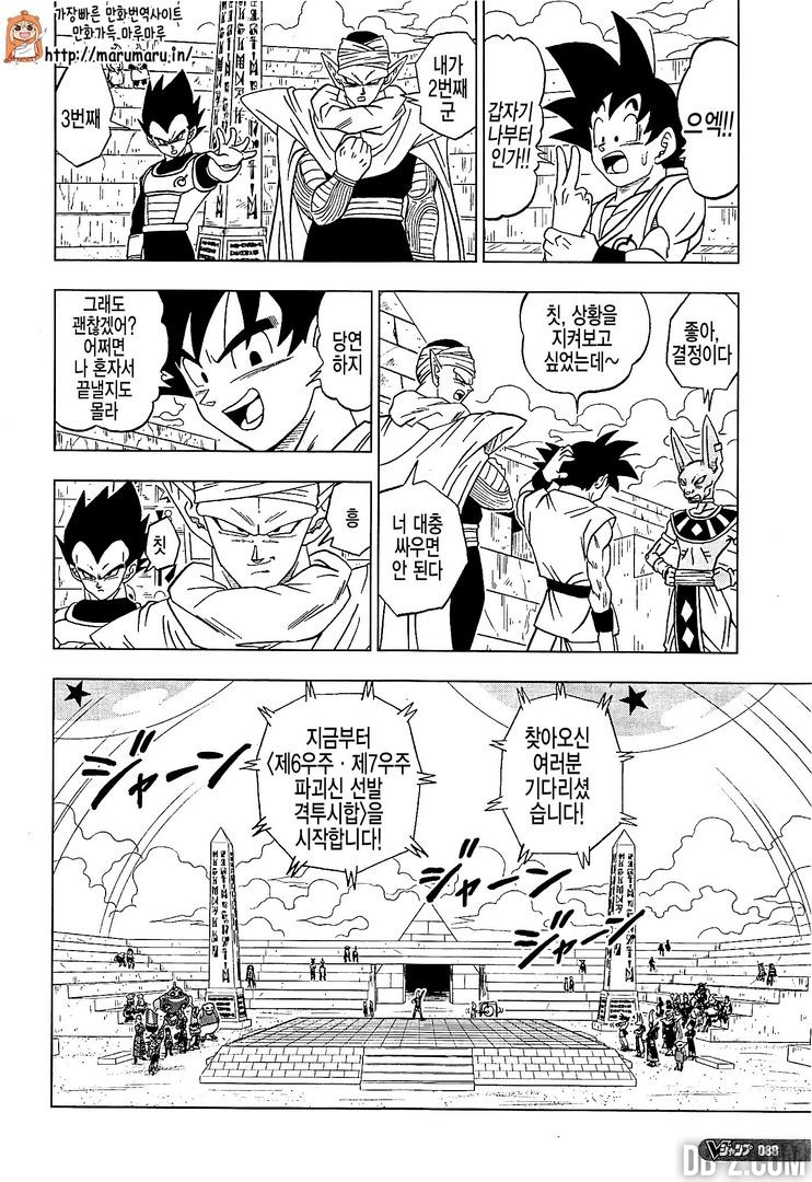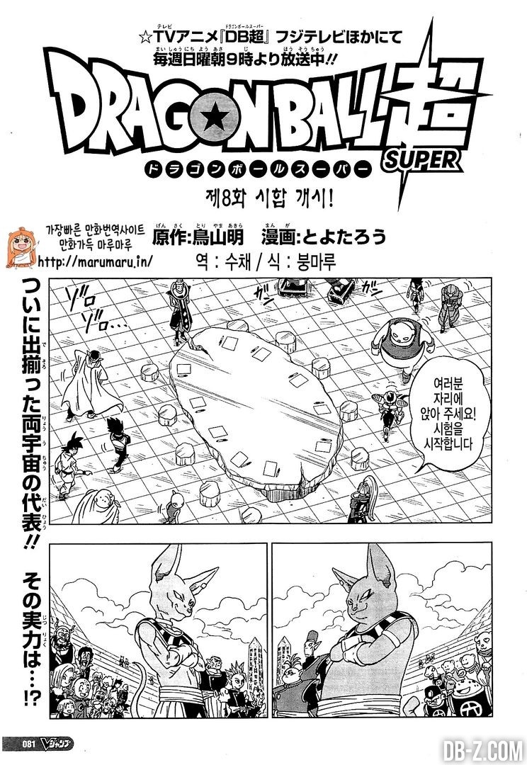 Voici le chapitre 8 de Dragon Ball Super ! Comme le chapitre 7 de Dragon Ball Super, ces nouvelles pages sont publiées dans le nouveau numéro du magazine V-Jump du mois, et encore une fois, ça va beaucoup plus vite que l’animé. Ce chapitre est toujours centré sur l’organisation du tournoi inter-univers et sur la quête de la 7ème Super Dragon Ball. Les équipes des Univers 6 et 7 sont arrivées sur la Planète Sans Nom pour le tournoi, et c’est le coup d’envoi qui est donné dans ce chapitre ! Bref, voici la suite du manga Dragon Ball Super avec, pour rappel, un rythme de publication d’un chapitre par mois, écrit par Akira Toriyama, et dessiné par Toyotaro.