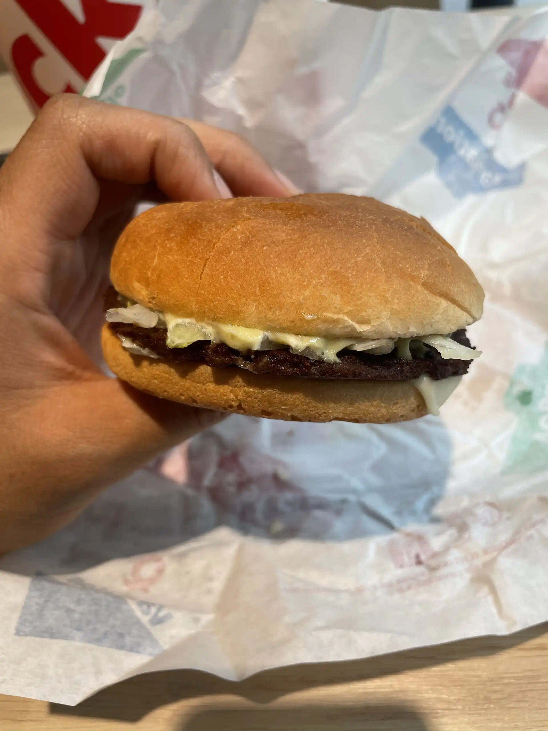 Pour l’avoir goûté, c’est à peu près comme un Giant, et je n’ai relevé aucun goût particulier, aucune signature en terme de saveur. C’était vraiment fade. Et la présentation est tout aussi pauvre. Il n’y a aucune déco qui pourrait nous rappeler que c’est un burger sur le thème de Dragon Ball, en dehors d’un stickers sur le papier du burger. Le burger, parlons-en : il est dégonflé – un peu comme tous les burgers de McDo et Quick en France finalement. On est très loin de la photo promotionnelle. Mais ça aussi, c’est devenu un sport national apparemment dans ce genre de chaînes.