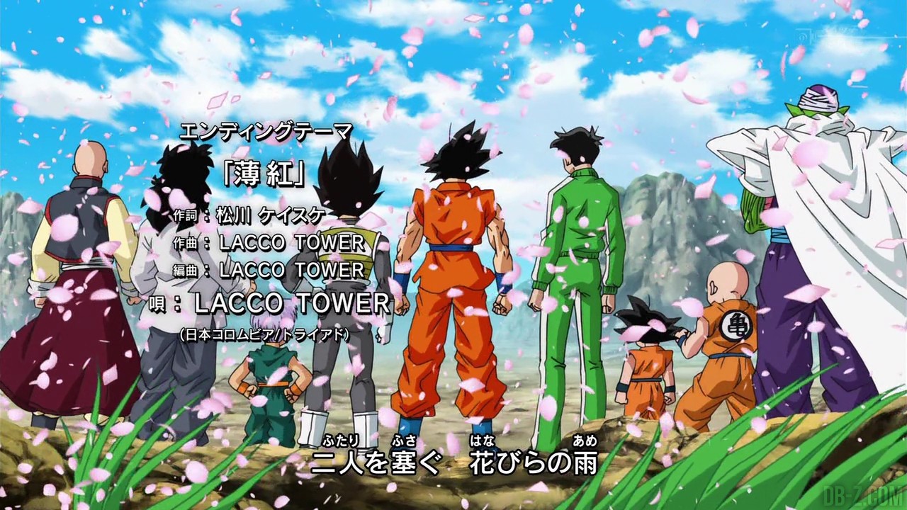 L’épisode 26 de Dragon Ball Super vient d’être diffusé au Japon, et comme annoncé, le 3ème ending – générique de fin de la série – a été diffusé en fin d’épisode. Il s’agit du titre 薄紅 (Rose clair / Light pink), interprété par LACCO TOWER, et dans cette vidéo, on voit Goku et ses amis sous une pluie de sakuras (fleurs de cerisiers), tout un symbole dans la culture jaopnaise (beauté éphémère, courage, renouveau,…). Le groupe de rock japonais en a profité pour rappeler qu’ils sont à l’origine de ce 3ème ending de Dragon Ball Super en le twittant ce matin après la diffusion de l’épisode 26, et en remerciant leur staff par la même occasion :