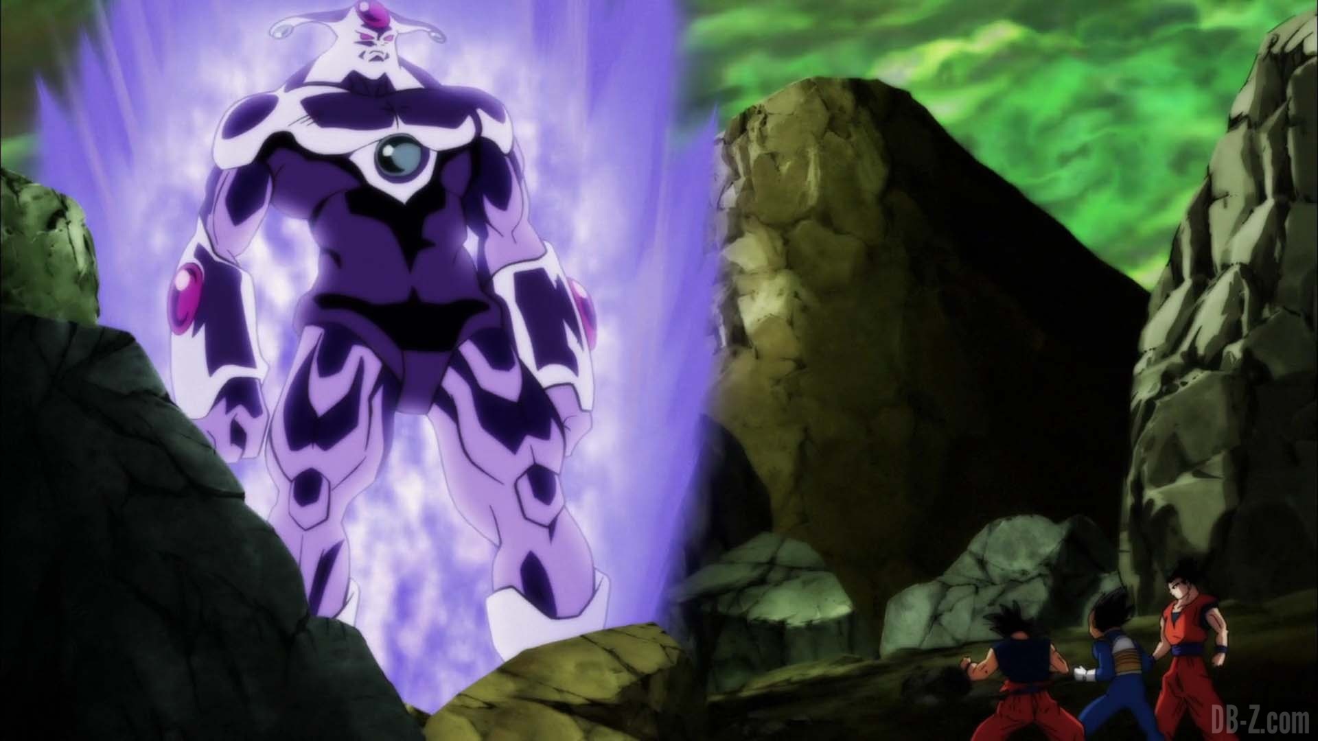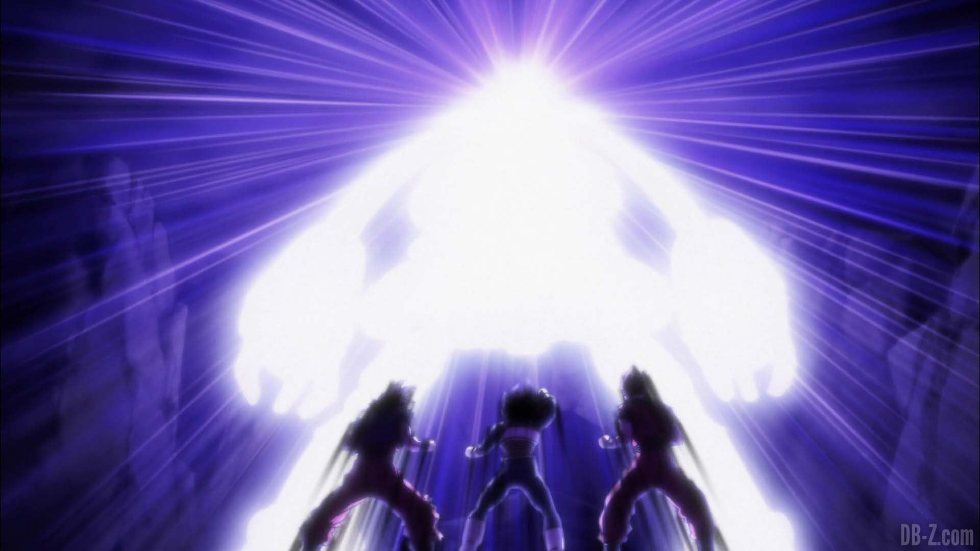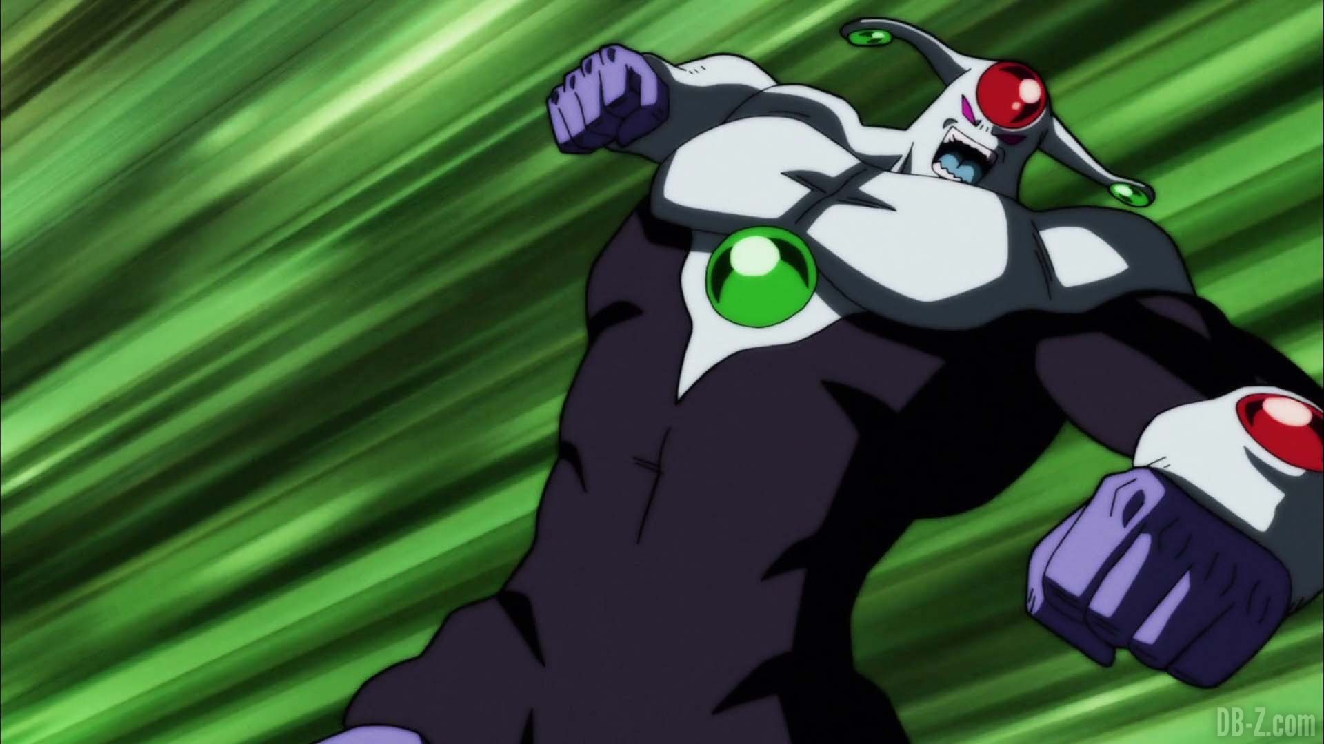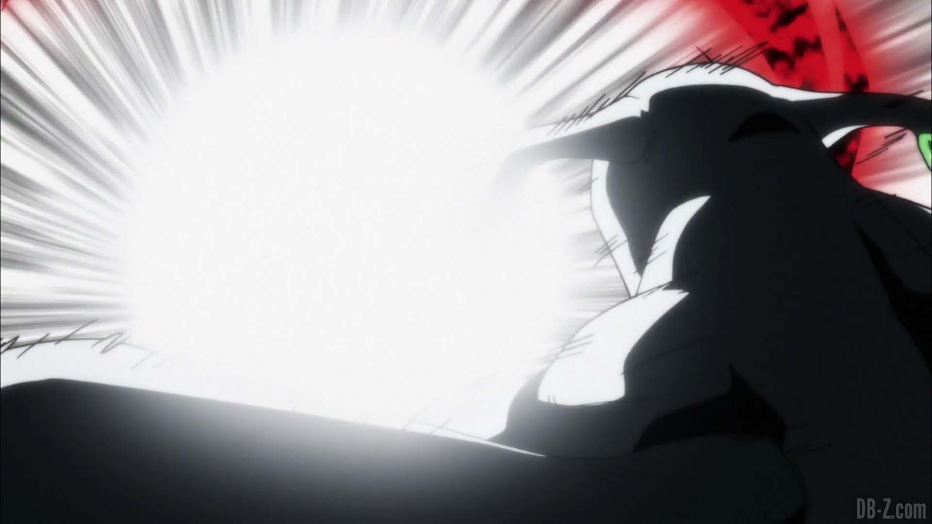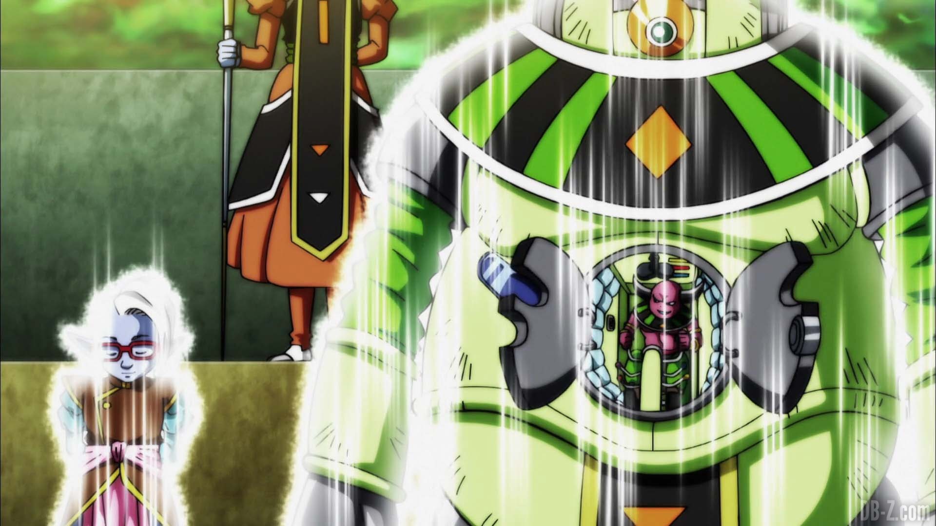 Synopsis 3 : Paparoni crie qu’il leur montrera la technique secrète ultime de l’Univers 3, et un flash intense enveloppe son corps. Goku, Gohan, Vegeta et les autres utilisent leurs mains pour se protéger de l’intense lumière, et C-17 et C-18 se baissent. Quand la lumière se dissipe et que leur vision revient, ils voient la forme gigantesque d’Aniraza.