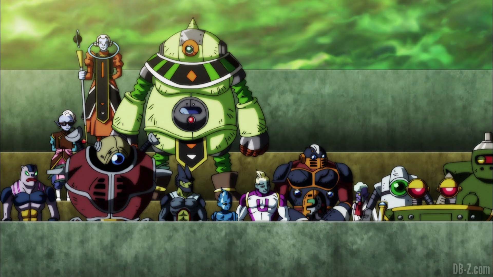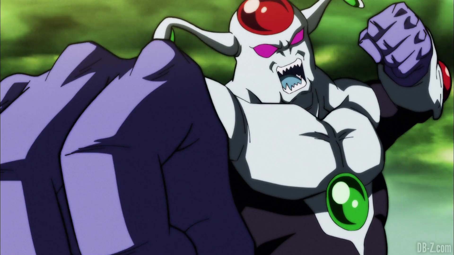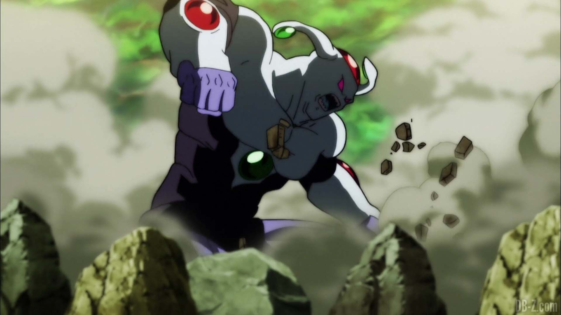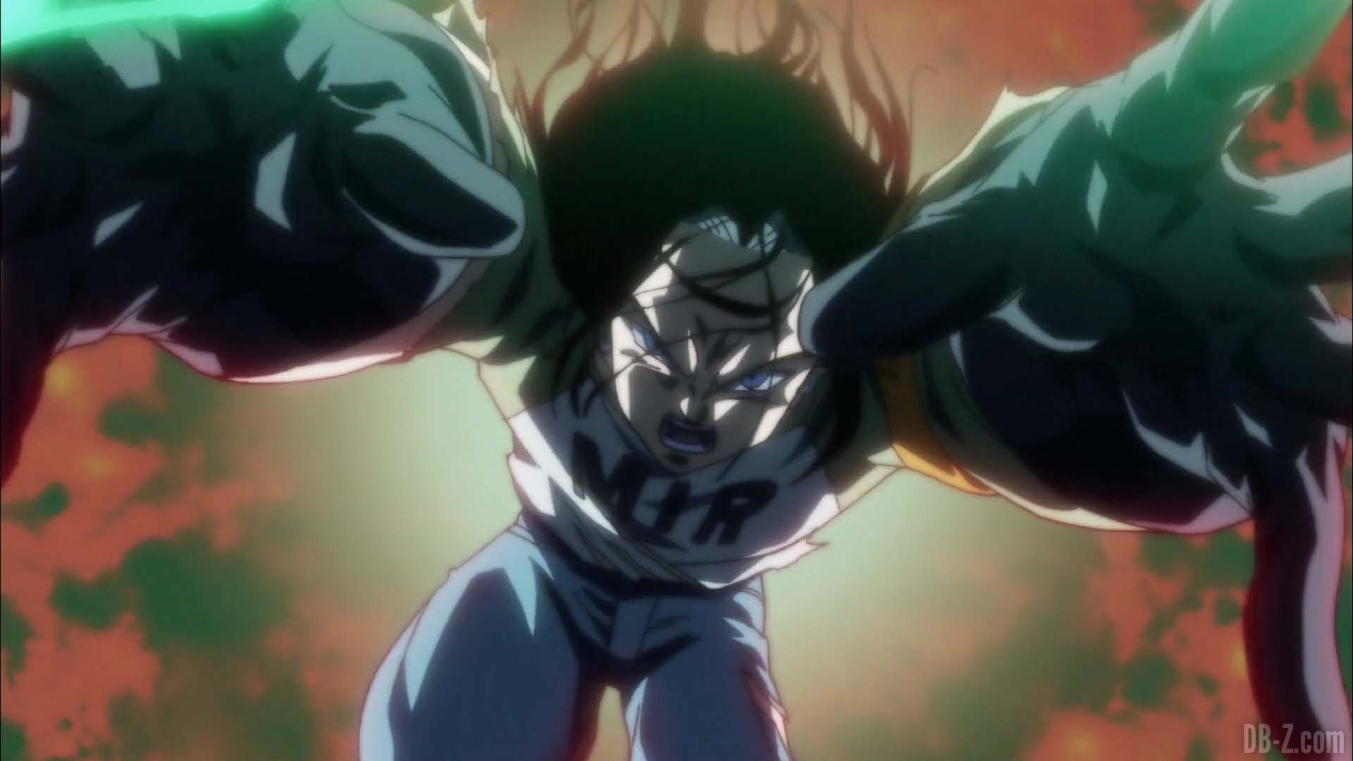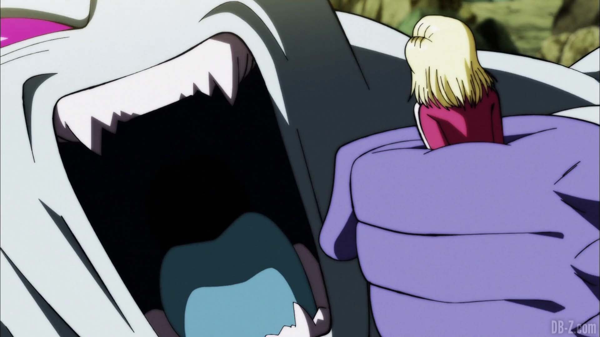 Synopsis 3 : Paparoni crie qu’il leur montrera la technique secrète ultime de l’Univers 3, et un flash intense enveloppe son corps. Goku, Gohan, Vegeta et les autres utilisent leurs mains pour se protéger de l’intense lumière, et C-17 et C-18 se baissent. Quand la lumière se dissipe et que leur vision revient, ils voient la forme gigantesque d’Aniraza.