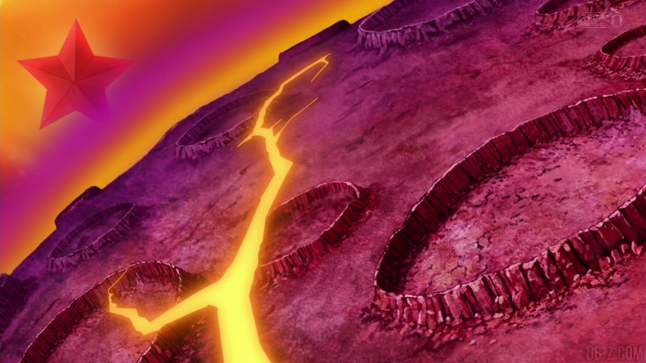 Maintenant, place aux Super Dragon Balls ! Bulma utilise son Super Dragon Radar, et ne localise pas la 7ème boule. Mais C-18 remarque qu’il y a déjà 7 points sur le radar ! Monaka suggère de passer en vue 3D, et Whis pense que c’est une excellente suggestion. Il embarque tout le monde dans son vaisseau Cube loin de la planète Sans Nom, et Whis révèle en fait qu’il s’agit de la 7ème et dernière Super Dragon Ball. Whis explique que lorsque les Super Dragon Balls avaient été dispersées lors de leur dernière utilisation, cette 7ème Super Dragon Ball avait dû entrer en collision avec une planète avant de se recouvrir de débris. Pour invoquer le Dieu des Dragons, il faut maintenant prononcer la formule, mais uniquement dans le langage des Dieux (qui est en réalité du Japonais dont les syllabes sont prononcées à l’envers) : « Apparaîs, Dieu des Dragons, et exauce mon souhait, s’il te plaît » (jeu de mot avec « chonmage » qui remplace « choudai ». « Chonmage » signifie en Japonais « s’il te plait », mais aussi un chignon sur la tête. Le jeu de mot n’est pas parlant en français, je vous l’accorde). Beerus traduit donc cette expression dans la langue des dieux, mais a du mal avec « chonmage ».