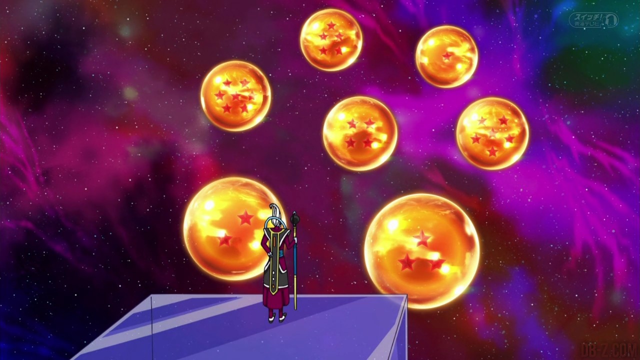 Il demande ce que c’est car il ne sait pas le traduire, et Bulma explique que c’est la coiffure chignon porté par les samouraïs ou les lutteurs de sumo, mais Beerus dit qu’il n’y a pas de mot dans la langue divine pour ça. Bulma suggère qu’il laisse donc le mot tel quel, et Whis formule le message de cette façon. Après un petit moment d’attente, un dragon d’or gigantesque apparaît en avalant tout sur son passage, y compris le vaisseau bloc de Whis ! Ils se retrouvent tous dans le corps du « Super Shenron » (c’est ainsi qu’ils l’appellent), et Goku se demande s’il ne va pas les chier par les fesses. Une version plus petite de ce « Super Shenron » apparaît devant eux, et Beerus explique que c’est le noyau du « Super Shenron ». Il leur parle dans la langue des dieux, et demande quel est leur souhait. Beerus dit quelque chose dans la langue divine à Whis, qui le répète à Super Shenron. Après l’avoir exaucé, il disparaît et Bulma exige de savoir ce que Beerus a demandé (elle avait peur qu’il fasse un voeu de destruction). Il prétend qu’il a juste demandé un lit plus confortable, mais en vérité… Pendant que Champa et Vados retournent dans leur propre univers, Vados s’arrête car elle a remarqué que la Terre de l’Univers 6 a été restaurée avec le même niveau de civilisation que la Terre de l’Univers 7 ! Maintenant Champa peut obtenir tous les plats savoureux de la Terre qu’il veut ! Champa se rend compte que c’est Beerus qui lui a offert ce cadeau… Mais il est ennuyé : il lui est désormais redevable. De retour sur la planète Beerus, Goku veut toujours s’entraîner avec Monaka et Beerus lui promet de lui laisser très bientôt, mais qu’il est maintenant temps pour lui de rentrer à la maison. Beerus paie secrètement Monaka avec un énorme tas d’or pour l’avoir aider à motiver Goku dans ce championnat, et Monaka peut retourner à son travail ordinaire (apparemment une sorte de livreur). Goku et ses amis retournent sur Terre, et Piccolo dit que ce prochain tournoi entre tous les univers sera incroyable. Jaco est d’accord, en disant qu’il va prendre un autre jour de congé pour venir le voir.