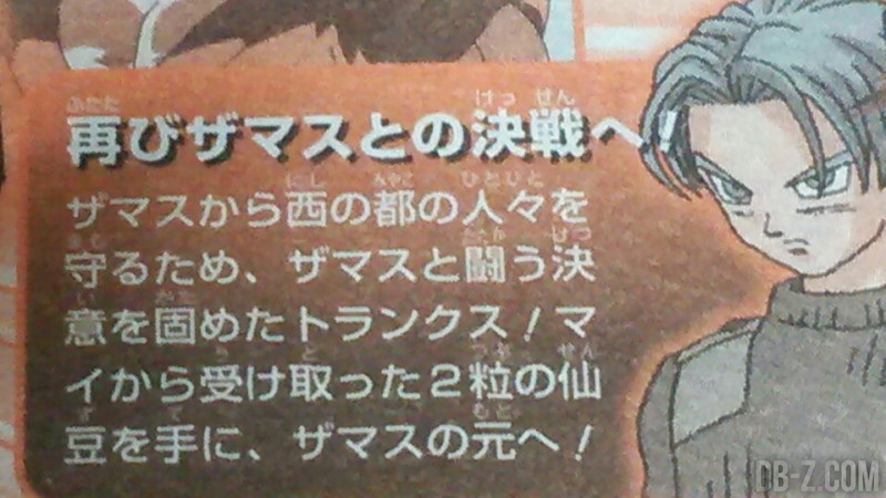Pour protéger les habitants de la Capitale de l’Ouest de Zamasu, Trunks est solidement déterminé à affronter Zamasu ! Ayant reçu 2 Senzus par Mai, il fonce vers Zamasu ! (Traduction DB-Z.com : Merci de nous créditer si vous prenez notre traduction)