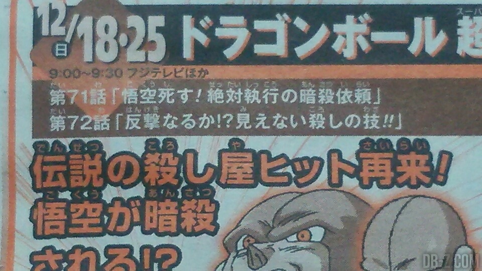 Synopsis du WSJ : Le retour de l’assassin légendaire : Hit ! Il doit assassiner Goku !? Lors d’une journée comme une autre, Goku ressent la présence d’un individu assoifé de sang ! Celui qui est venu tuer Goku est l’assassin Hit… Une lutte acharnée contre Goku commence… (Traduction DB-Z.com)
