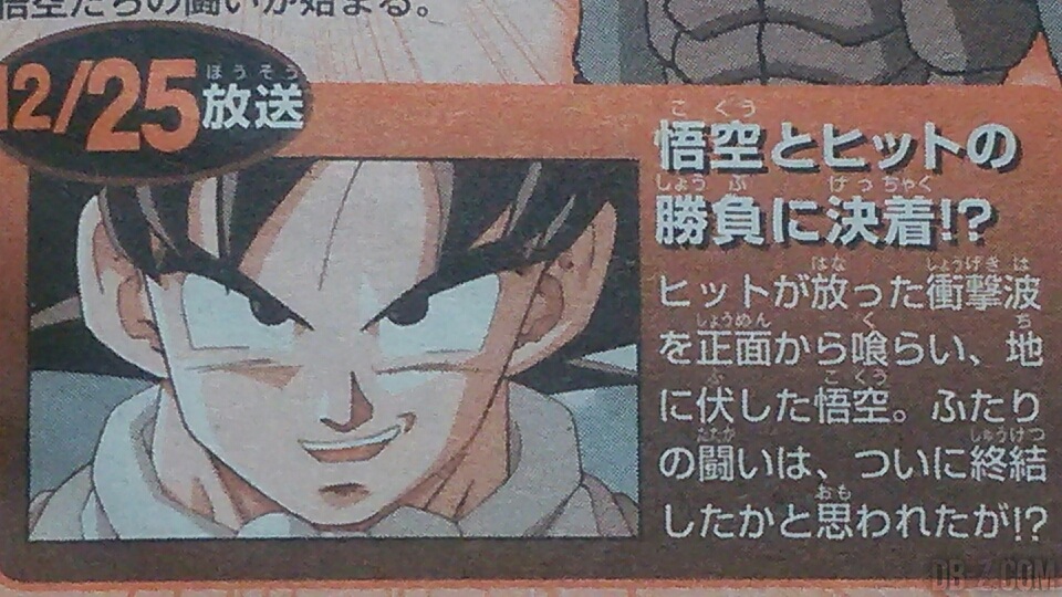 Synopsis du WSJ : La conclusion du combat entre Goku et Hit !? Goku est à terre après s’être pris l’onde de choc de Hit à bout portant. On pourrait penser que leur combat a finalement pris fin, mais !? (Traduction DB-Z.com)