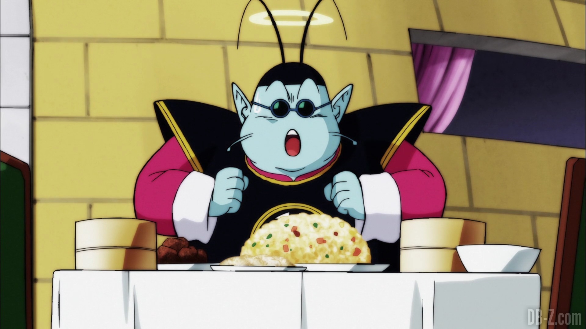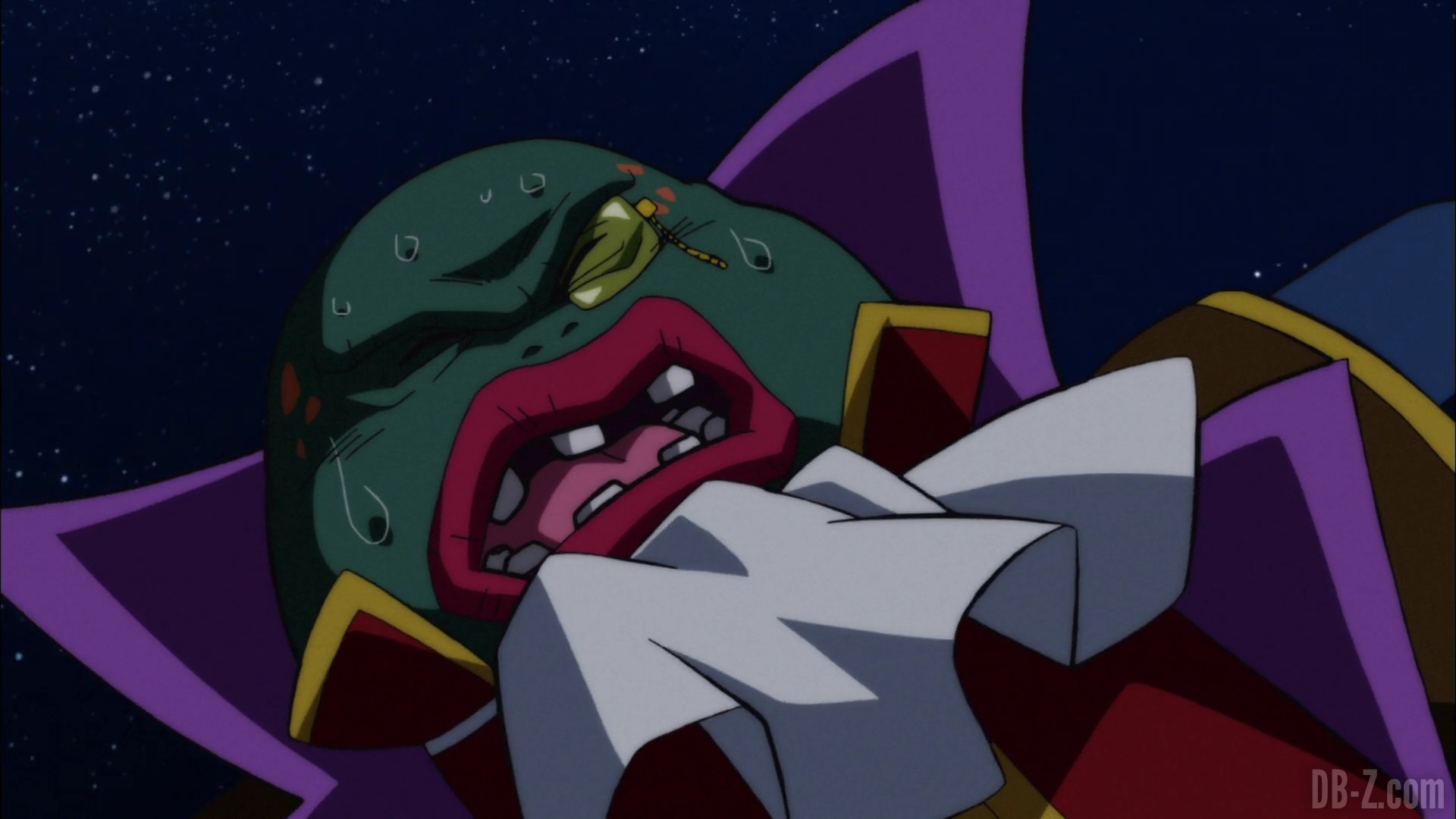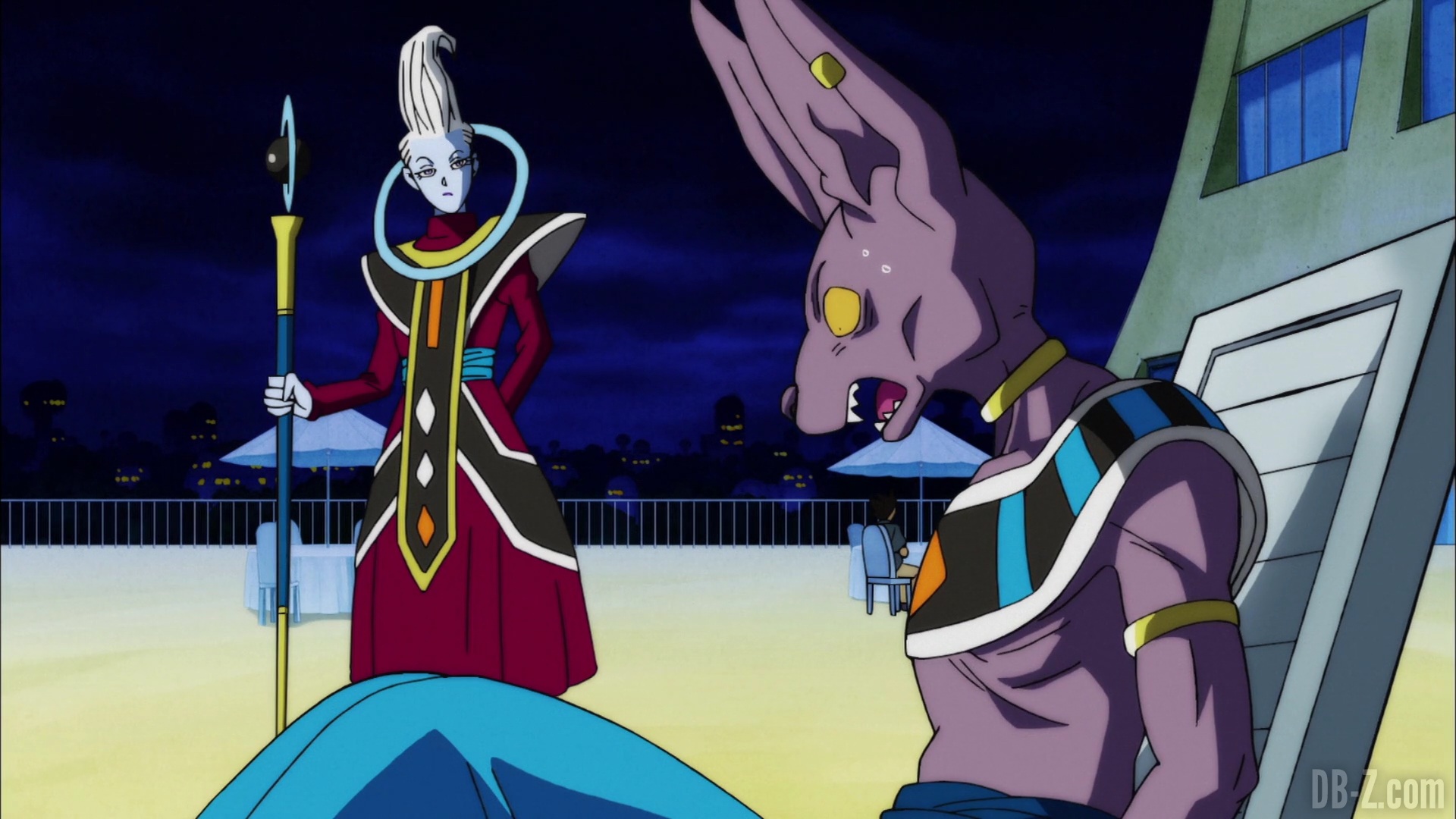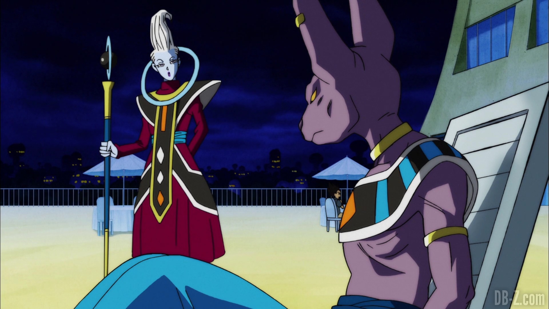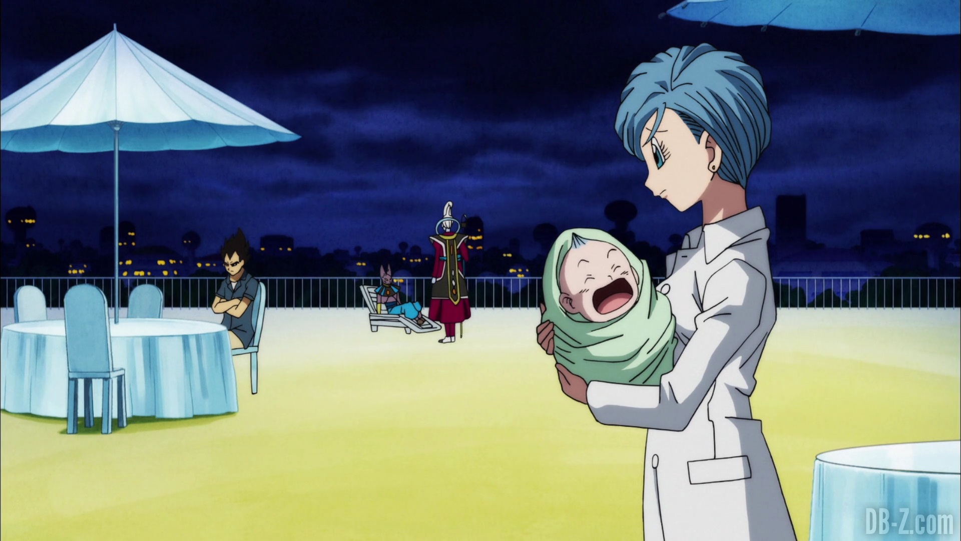 Et il le fait ! Le boss appuie sur le bouton, et le vaisseau explose… mais en fait, cette partie est un rêve de Beerus qui se réveille effrayé. Il dit à Whis qu’il a eu un terrible cauchemar dans lequel Goku est mort. Ce doit être un mauvais présage ! Le cri de Beerus fait que Bra commence à pleurer, et Vegeta enrage contre Beerus. Sa maison n’est pas un hôtel !