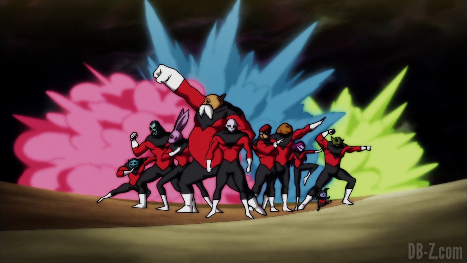 En voyant que tous les guerriers sont arrivés, Liquiir et les autres posent les blocs de l’arène restants. Les guerriers évitent ces blocs volants à toute allure, y compris Goku, mais Jiren reste parfaitement immobile, et les blocs le frôlent. Goku se rend compte que Jiren était capable de lire parfaitement les mouvements du bloc à l’avance. Il est vraiment fort.
