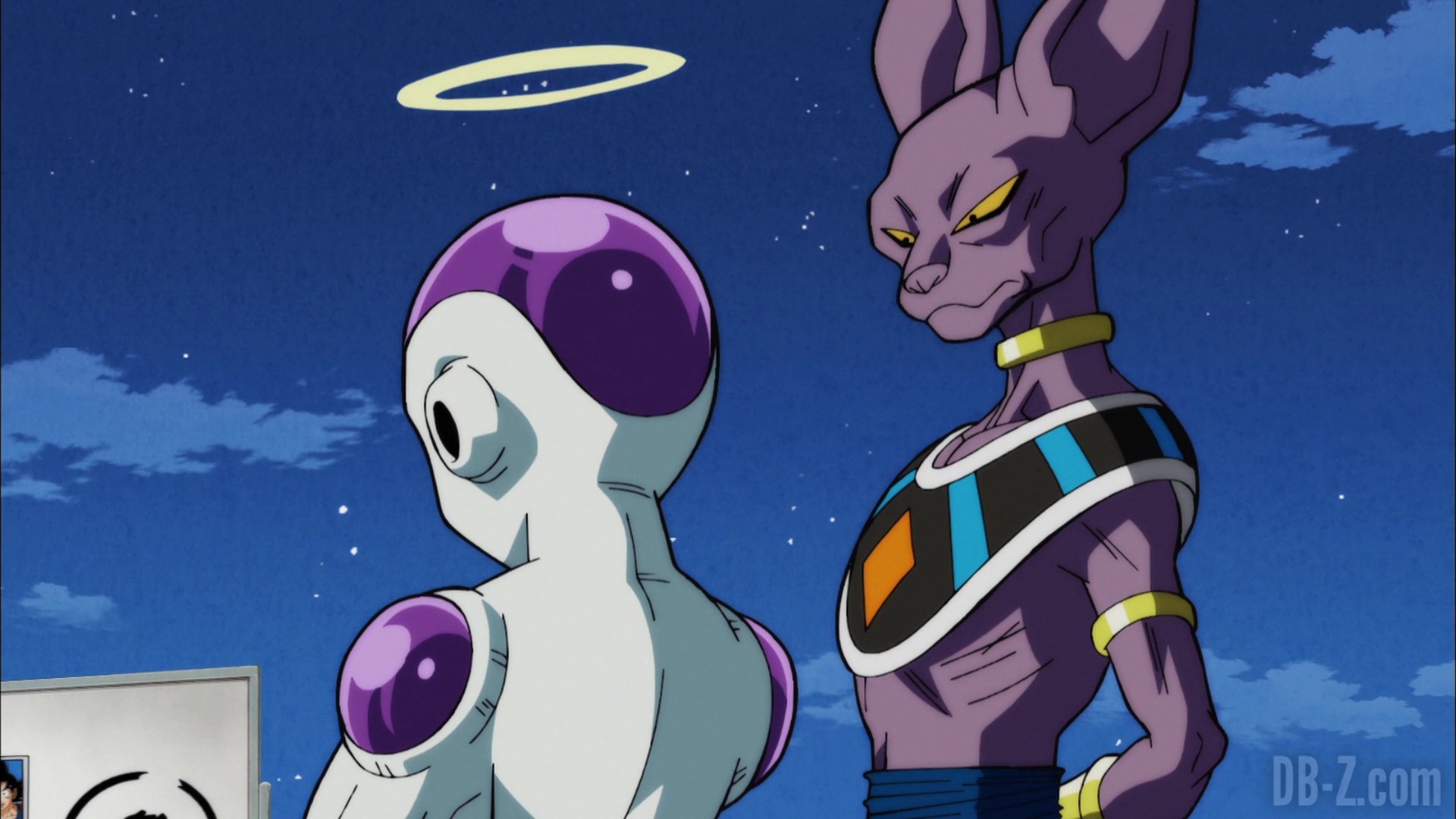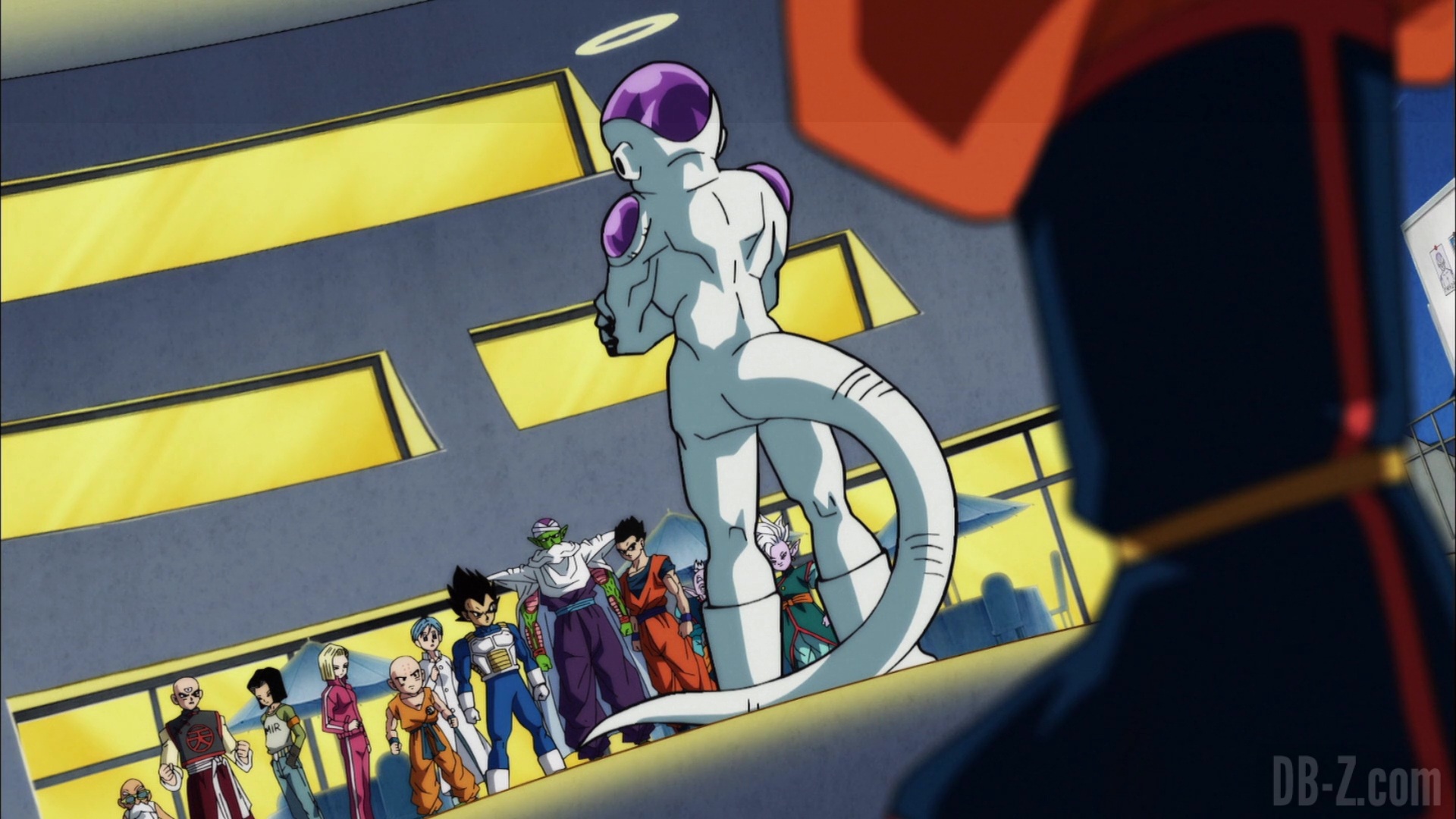 Sur Terre, l’ambiance est tendue : Freezer rencontre le reste de l’équipe de l’Univers 7 chez Capsule Corporation. Beerus avertit Freezer qu’il ne le laissera pas les berner. Vegeta se moque du halo de Freezer, et Freezer propose de lui en « offrir » un aussi. Tenshinhan se demande s’ils peuvent vraiment utiliser Freezer en tant que membre de l’équipe, mais Goku lui assure qu’il pourra s’occuper de lui en cas de problème. D’ailleurs, il n’y a personne d’autre qu’ils puissent utiliser à la place de Buu… Sur le côté, Yamcha, Puar et Oolong espionnent la conversation. Puar console Yamcha de ne pas avoir été sélectionné dans l’équipe, mais il semble le vivre bien.