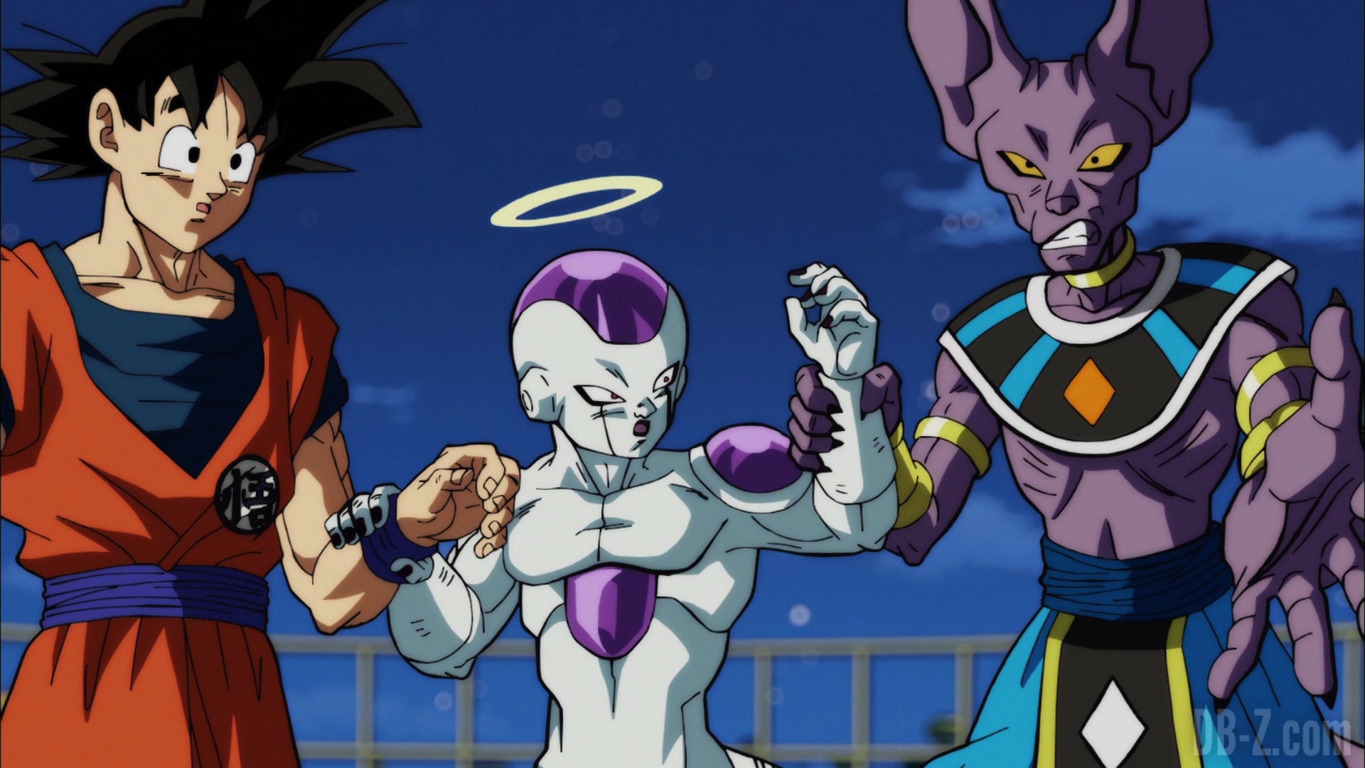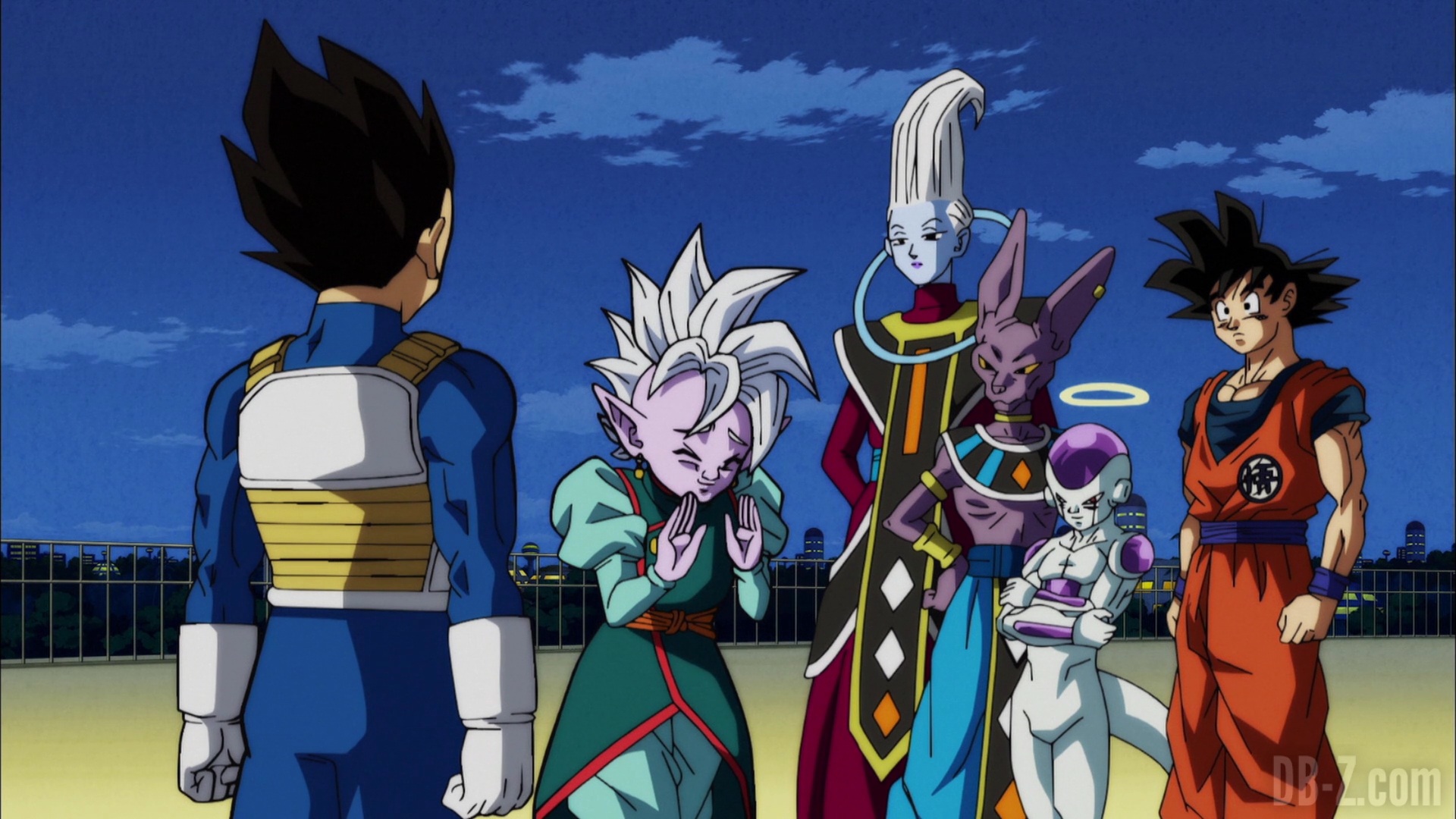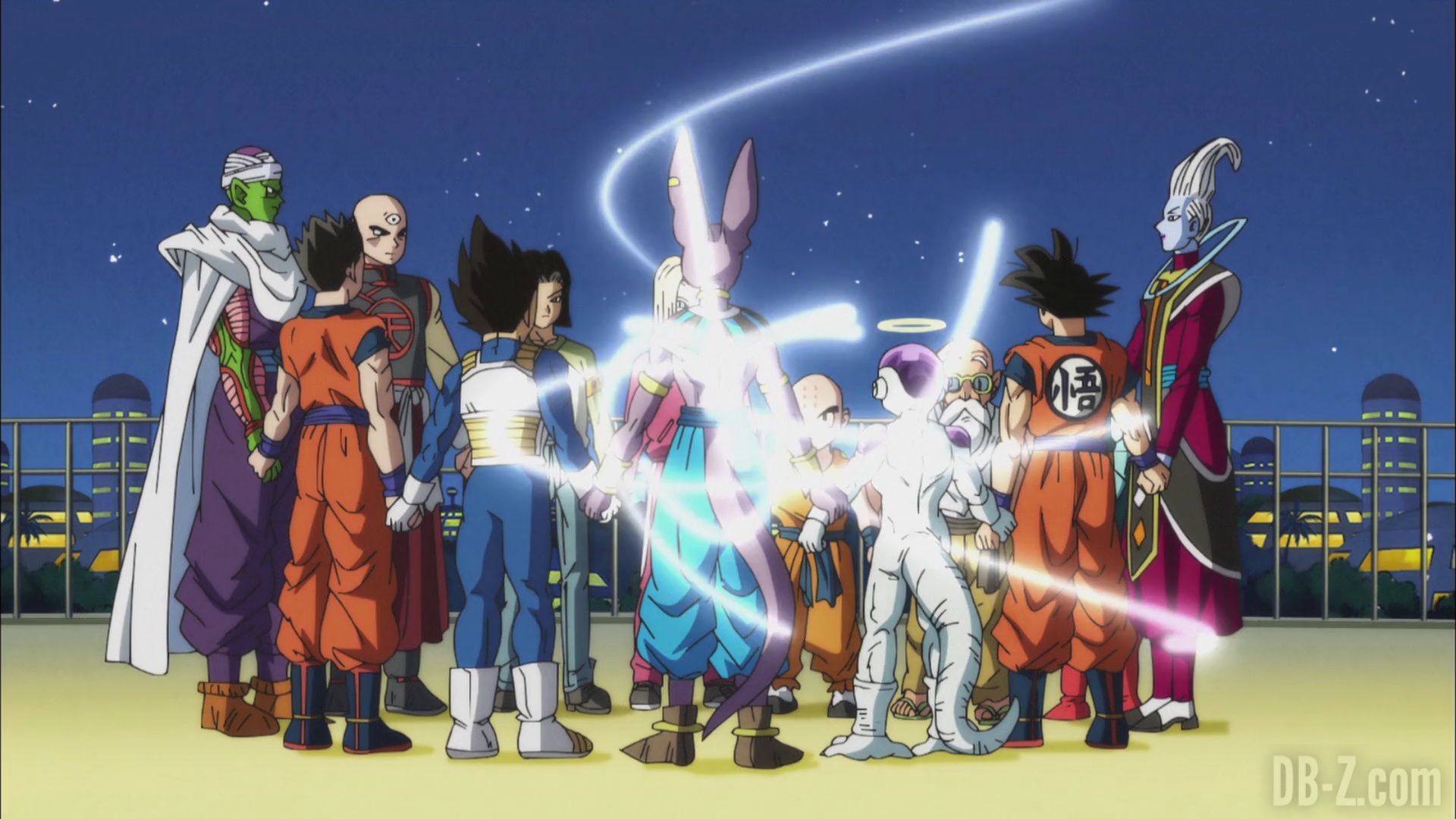 Whis annonce qu’il est temps de partir, et que pour se téléporter vers l’arène, tout le monde devra se tenir la main. Vegeta refuse de prendre la main de Freezer, mais Beerus entre et joue l’intermédiaire en prenant la main de Freezer d’un côté, et celle de Vegeta de l’autre. Whis contacte le Grand Prêtre qui téléporte l’équipe dans le Monde du Vide. En voyant l’équipe partir, Yamcha dit que le sort de la Terre et de tout son univers est désormais entre leurs mains.