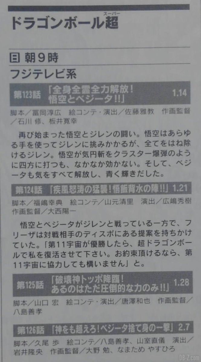 Pour rappel, la fin de l’arc du Tournoi du Pouvoir avait été annoncée pour mars 2018 dans une interview du réalisateur et du producteur de Dragon Ball Super. On ne sait pas si la série continuera ensuite, et encore moins si on aura droit à des fillers ou une suite écrite par Akira Toriyama. A l’époque de l’interview de Hiroyuki Sakurada et Masatoshi Chioka, Akira Toriyama n’avait toujours pas transmis de script pour la suite. Bref, voici ce qui nous attend pour les semaines à venir dans les épisodes 123, 124, 125, et 126 de Dragon Ball Super.