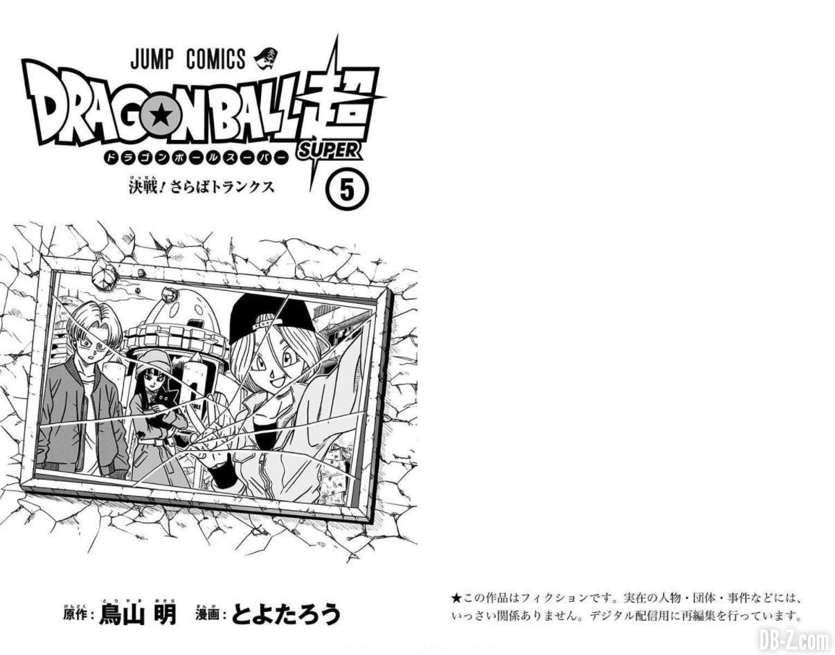 Le tome 1 comptait 9 chapitres de 17 pages chacun, le tome 2 comptait 6 chapitres d’une trentaine de pages chacun, tandis que le tome 3 comptait 5 chapitres d’environ 40 pages chacun pour un total d’environ 200 pages. Le tome 4, dernier en date, contenait 4 chapitres de 40 pages également. Le titre de ce tome 5 de Dragon Ball Super, intitulé « Combat décisif ! Adieu, Trunks » (決戦!さらばトランクス).