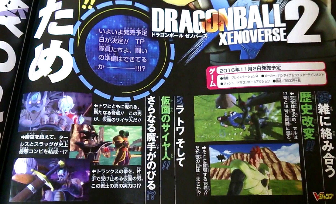 Ceux qui nous suivent sur Facebook et Twitter ont eu les images ce matin : Trois nouveaux personnages ont été dévoilés dans le V-Jump du mois concernant Dragon Ball Xenoverse 2, Il s’agit de Cell (1ère forme), C-16, et Time Breaker Bardock, c’est-à-dire Bardock avec le masque d’envoûtement des Time Breakers (l’organisation maléfique de Demigra, Towa, et Mira)… Et on ne veut pas mettre de l’huile sur le feu, mais le scan mentionne clairement Mira aux côtés de Towa et Time Breaker Bardock, toutefois c’est subtil car il n’est pas dit mot-à-mot qu’il fera son retour dans le jeu… mais franchement, on y croit, surtout après la fin de Xenoverse 1.