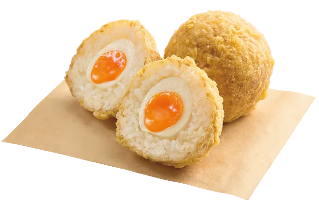 - Présentation : Boule de riz frit de grande taille, garnie d’un œuf mollet coulant. Enrobée de sésame blanc et noir. Inspirée de l’attaque Genki Dama.