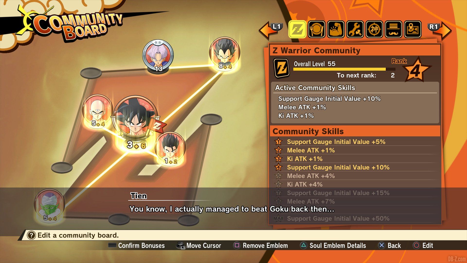 Complétez les quêtes pour les personnages non joueurs (PNJ) de Dragon Ball Z Kakarot afin d’obtenir leurs « Soul emblems » (=emblèmes d’âme), et ainsi améliorer vos relations avec eux ! Vous activerez des effets spéciaux et débloquerez des interactions exclusives en collectant des emblèmes et en les plaçant dans le « Community Board » (=tableau social).