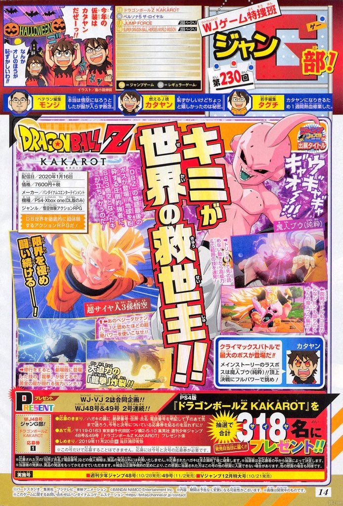 Bandai Namco est en pleine promotion de l’arc Buu dans Dragon Ball Z Kakarot. Le prochain jeu de type Action RPG de Bandai Namco sortira le 16 janvier 2020, et à trois mois de sa sortie, c’est au tour de Goku Super Saiyan 3 et de Majin Buu (petit) de faire le show. Cette page du Weekly Shonen Jump de la semaine, relayée par @ShonenGamez, nous en montre un peu plus.