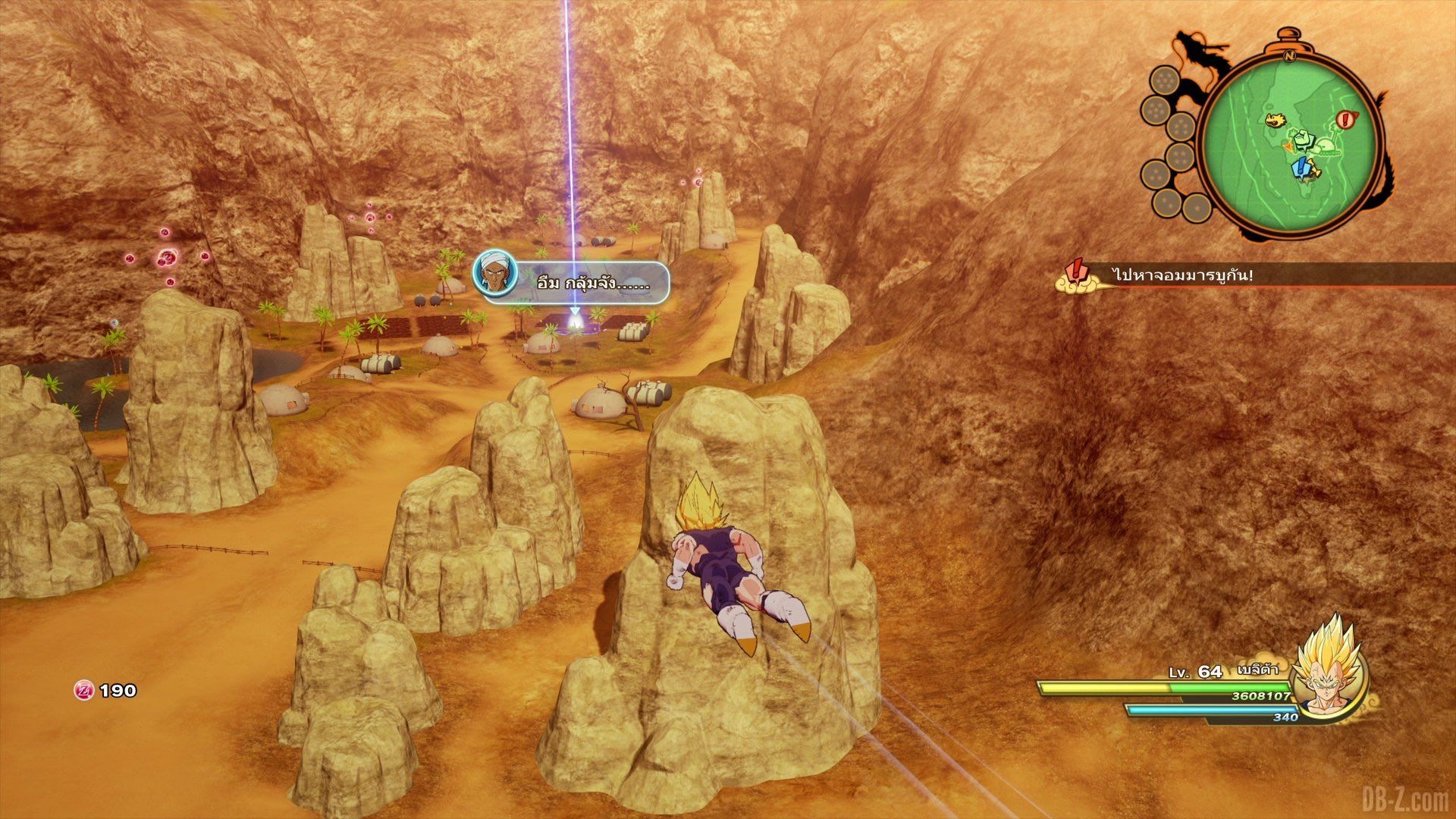 La première chose, qui ne surprendra personne, mais qui est toujours rassurante, c’est de constater que Majin Vegeta sera bien un personnage jouable ! Vous devrez donc affronter Majin Buu (probablement dans un combat de boss), mais vous aurez aussi la possibilité d’explorer la carte du jeu librement pour accomplir vos quêtes. En effet, on voit Majin Vegeta se déplacer librement dans l’une des images ci-dessous, et on le voit également s’adresse à Nam.