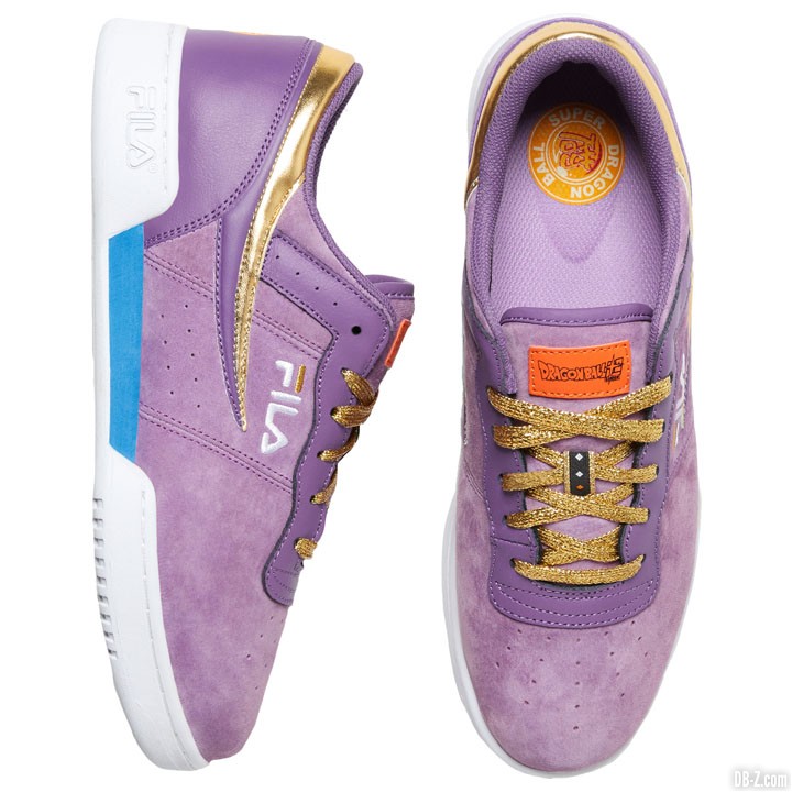 Inspiré de l’antagoniste Beerus, lui-même inspiré de l’un des chats d’Akira Toriyama, le deuxième style Original Fitness de Fila dans cette collection comprend des tiges en daim et cuir violet avec des lacets en or métallisé. La paire basse est dotée de semelles extérieures polyvalentes en caoutchouc blanc.