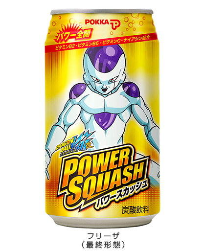 Power Squash, c'est une célèbre boisson énergétique Japonaise, au goût pouvant se définir comme une sorte de Red Bull saveur orange. Elle s'achète principalement sous forme de canette, en distributeur automatique. C'est la marque Pokka qui commercialise cette boisson, et qui utilise à nouveau la licence Dragon Ball pour booster les ventes de ses boissons énergétiques, comme ils le font actuellement pour leur café en canette (voir news ci-dessous). Il y a au total 12 canettes à collectionner, avec de magnifiques illustrations couvrant toute la saga Dragon Ball Z.