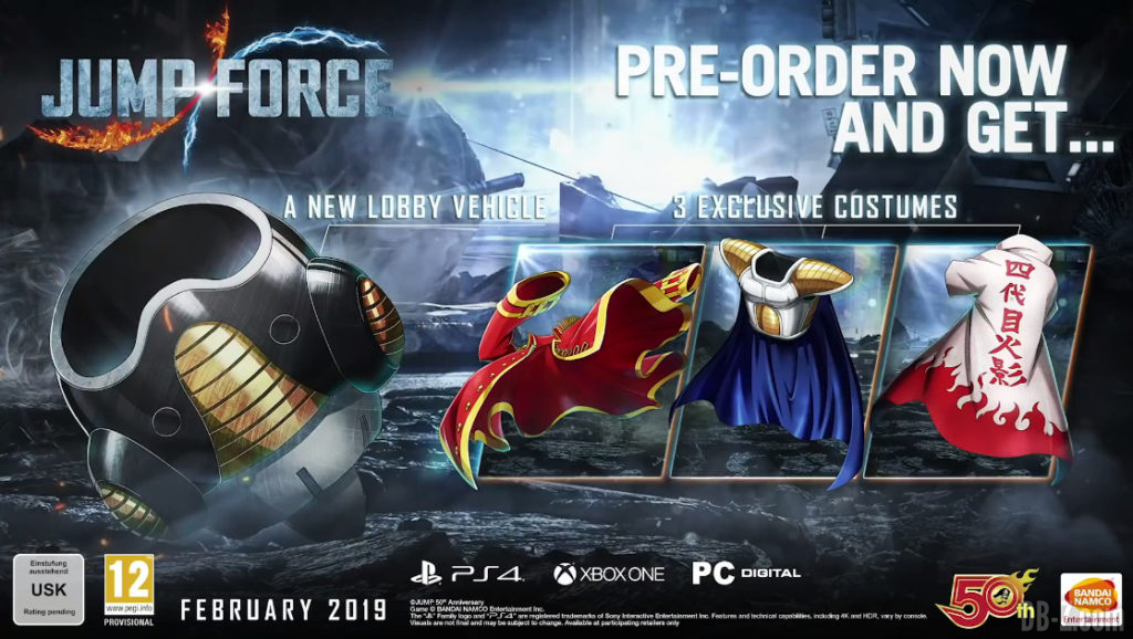 Des costumes exclusifs et le vaisseau de Freezer seront offerts pour toute précommande. Niveau costume, ils viennent de One Piece (tenue de pirate), Dragon Ball (tenue du prince Vegeta), et de Naruto (tenue du 4ème Hokage).