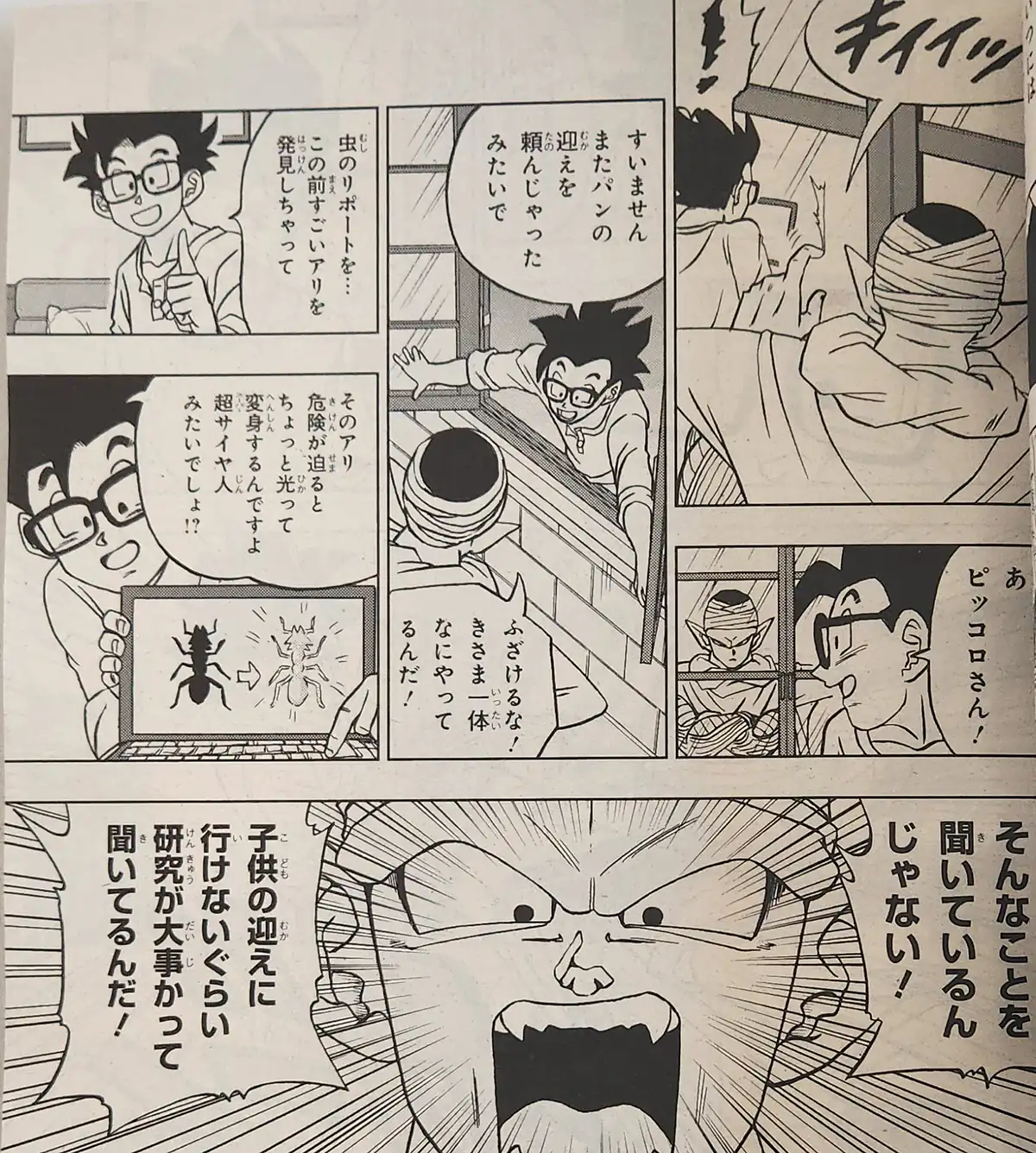 D’autre part, on se rend compte que le manga apporte encore plus de détails que dans le film, comme cette apparition de Krilin qui n’existe pas dans le long métrage ! De plus, Piccolo s’entraîne avec Pan, comme c’est déjà bien introduit dans les brouillons des premières pages du chapitre 91 de Dragon Ball Super.