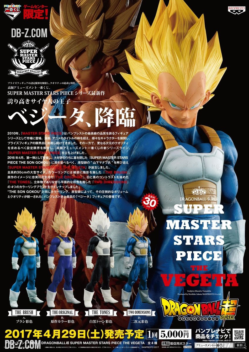 Pour rappel, la date de sortie de la SMSP The Vegeta est programmée au 29 avril 2017 au Japon. Il faudra se rendre en Game Center pour acheter un ticket de loterie Ichiban Kuji à 5000 yen / 40 € qui vous assurera de gagner une des quatre versions de la SMSP The Vegeta.