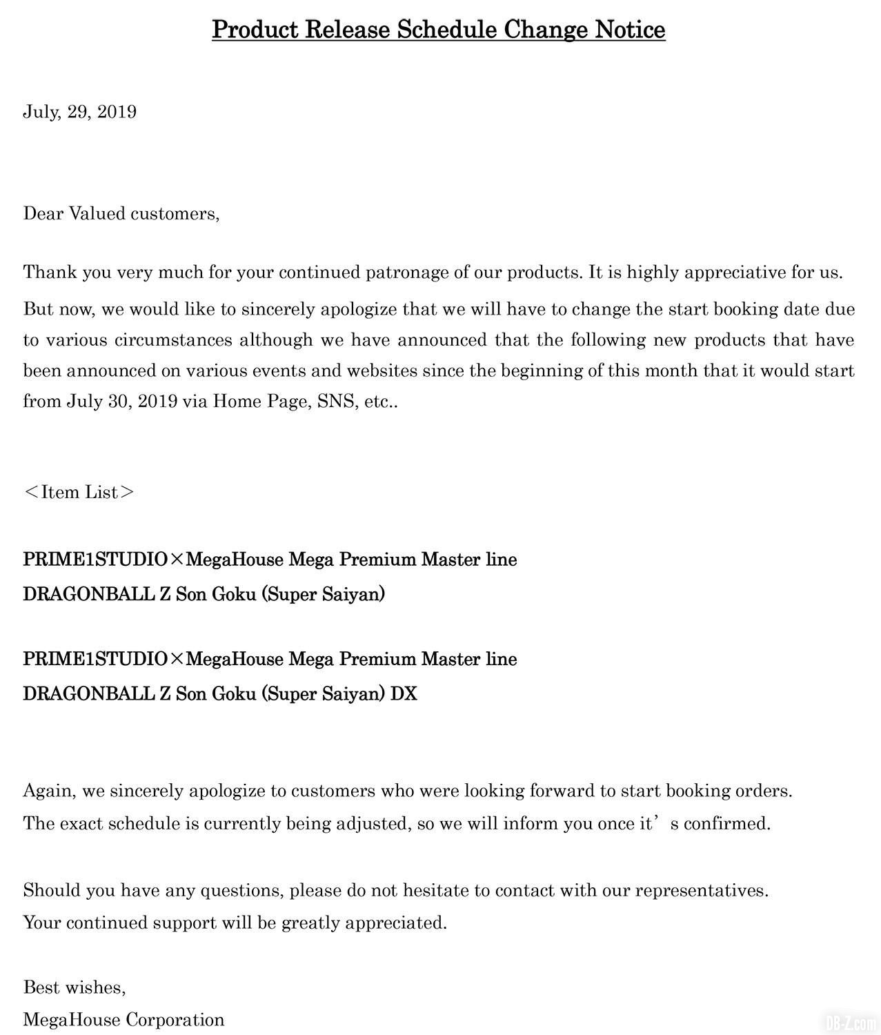 « Nous sommes sincèrement désolés pour le désagrément occasionné, mais la précommande de la statue de Goku sera retardée en raison de circonstances imprévues. Veuillez lire les détails indiqués ci-dessous. Nous vous informerons dès que possible de la nouvelle date de précommande (d’ici environ 2 semaines). »