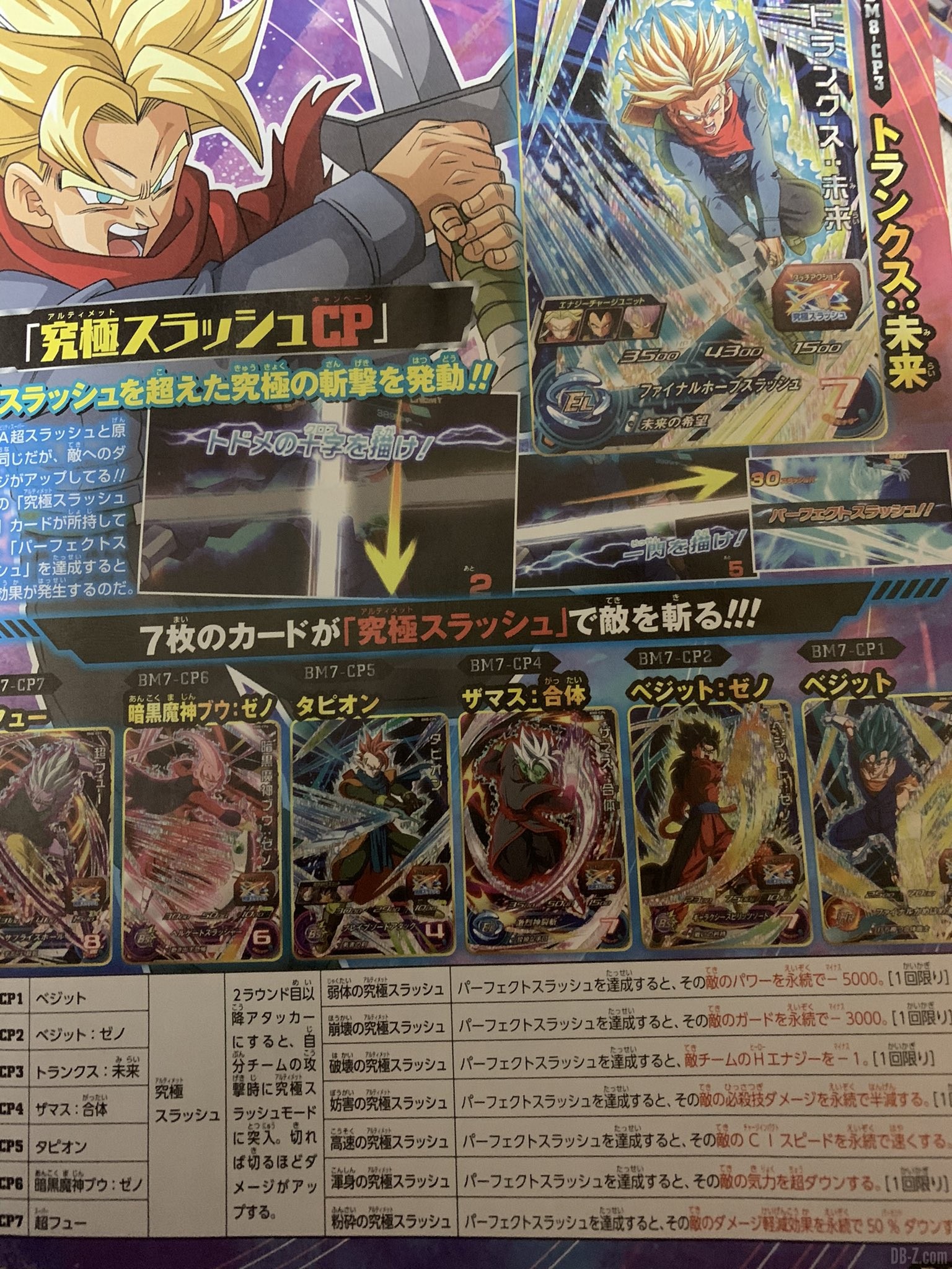 Avec Super Dragon Ball Heroes Big Bang Mission 8, les joueurs pourront également gagner dans les bornes d’arcades 7 nouvelles cartes CP « Ultimate Slash ». Comme le suggère leur nom, elles permettront de donner le coup de grâce en effectuant une série de coup d’épée en bougeant sa carte dans le sens indiqué par les flèches de la bornes. On retrouve ainsi les meilleurs épéistes de SDBH, à savoir Trunks du Futur et son épée, Fu et sa dague, Majin Buu Xeno (on rappelle qu’il porte une épée), et Tapion. Mais on retrouve aussi des combattants avec des épées de ki, à savoir la fusion de Zamasu, Vegetto, et Vegetto Xeno avec leur lame spirituelle.