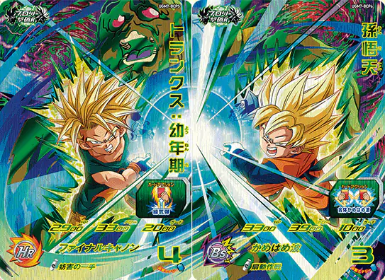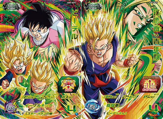 Les cartes Dramatic Arts sont également de retour. On peut considérer qu’elles jouent le rôle de cartes « parallèles » en ce sens où elles complètent leur carte jumelle. Par exemple ci-dessous, on voit l’attaque de Goku sur Broly sous deux angles différents. Concernant la carte de Gohan, il n’y a pas vraiment de logique, si ce n’est qu’on reconnaît le moment de paix qui précède le Cell Game.