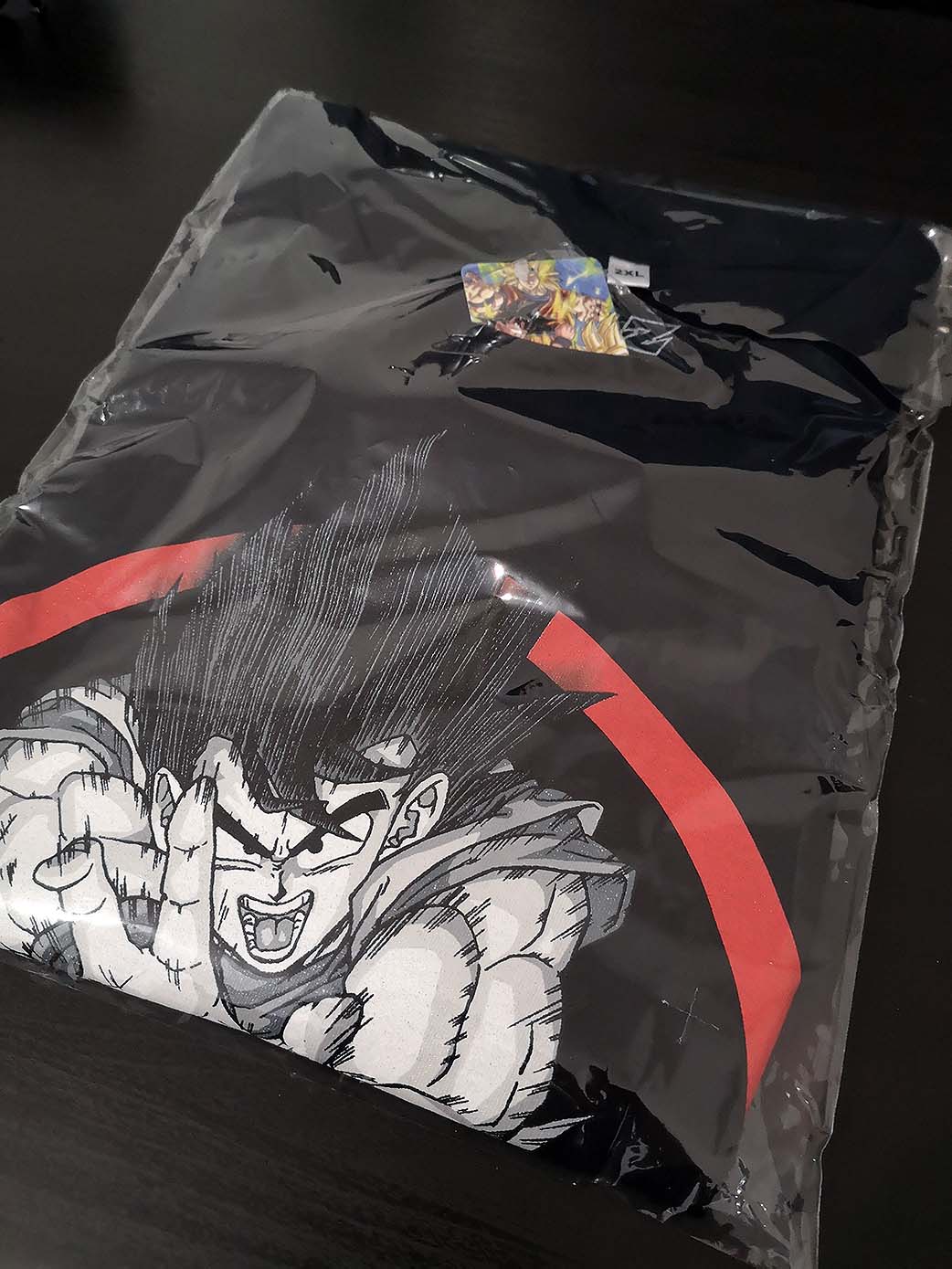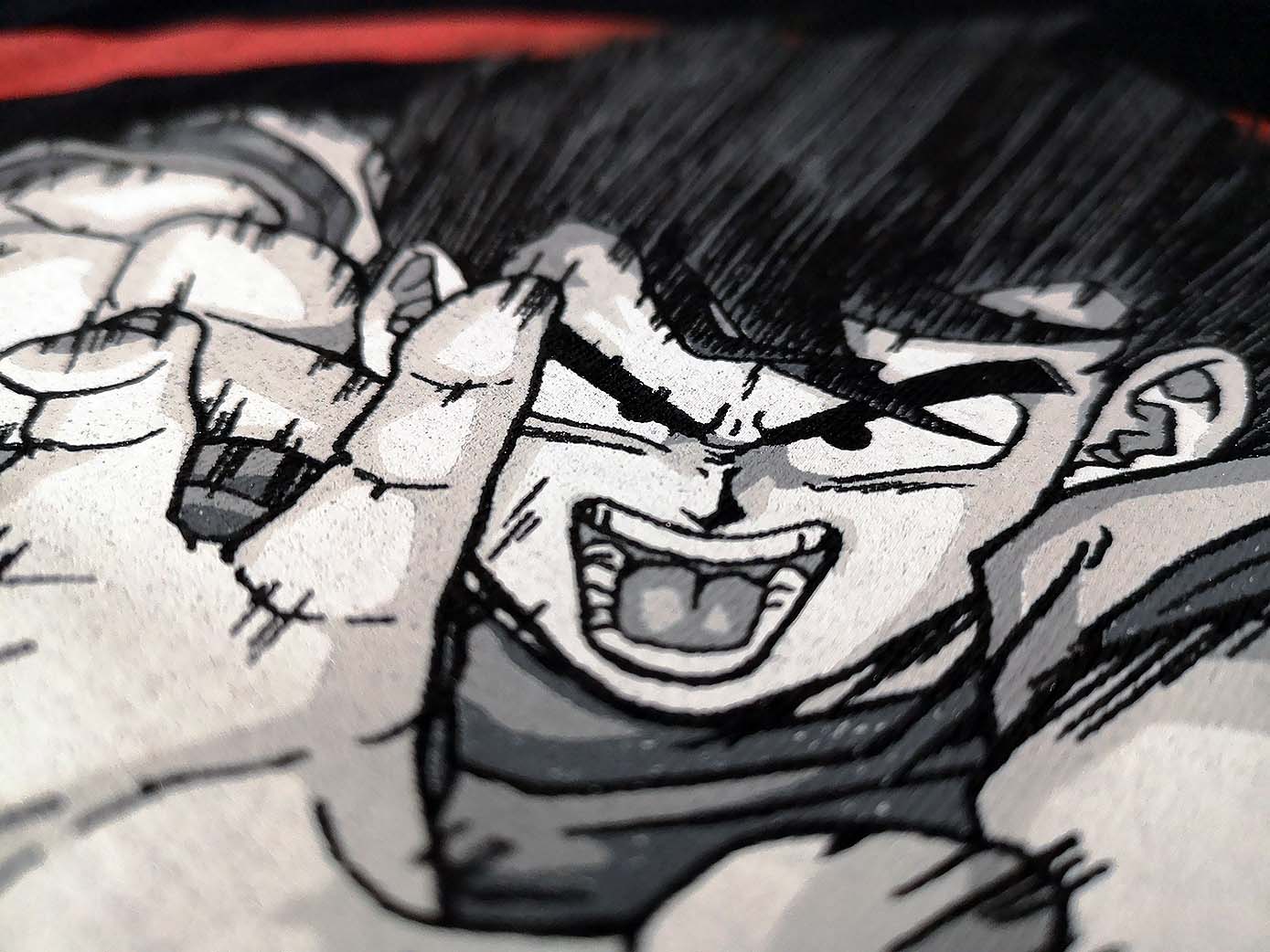 Un t-shirt noir, sobre, et classe. Goku libère toute sa puissance dans ce Kamehameha dont le flocage semble être de très bonne facture. Valeur seule : environ 22 euros.