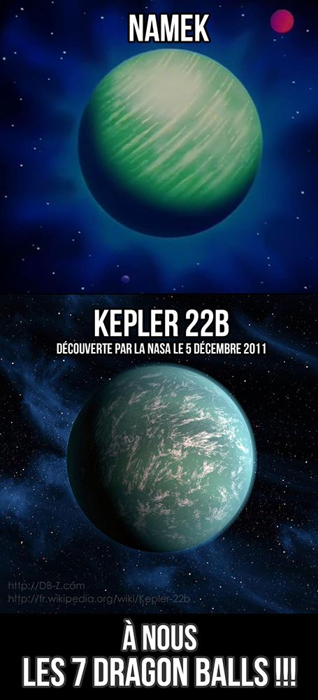 Vous avez peut-être déjà vu passer cette image, sur laquelle on voit une planète étrangement semblable à Namek. Cette planète, c’est l’exoplanète Kepler 22b, découverte par la NASA le 05 décembre 2011. D’accord, on a tous salué la ressemblance effective avec la planète Namek, et on s’est bien marré. Mais un fan américain de DBZ n’entend pas en rester là. En effet, ce Yamcha en herbe vient de créer une pétition sur le site change.org, dans laquelle il implore la NASA de renommer la planète Kepler 22B en l’honneur de la planète Namek de Dragon Ball. « Les habitants de Namek ont besoin d’une nouvelle planète depuis qu’un salaud nommé Freezer a détruit la leur« , proteste l’un des signataires. Même si ce projet ressemble surtout à un gros délire, ça pourrait être sympa de le suivre ! N’hésitez pas à signer.
